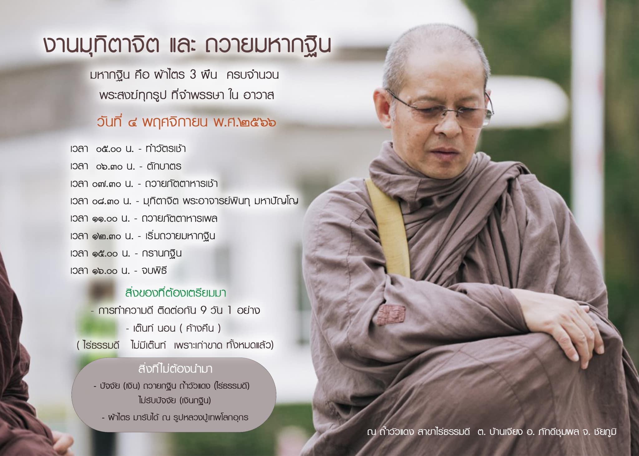 ขอเชิญร่วมงานมุทิตาจิตและถวายมหากฐิน ประจำปี 2566 ณ วันที่ 4 พฤศจิกายน 2566 นี้ ณ วัดถ้ำวัวแดง สาขาไร่ธรรมดี ต.บ้านเจียง อ.ภักดีชุมพล จ.ชัยภูมิ