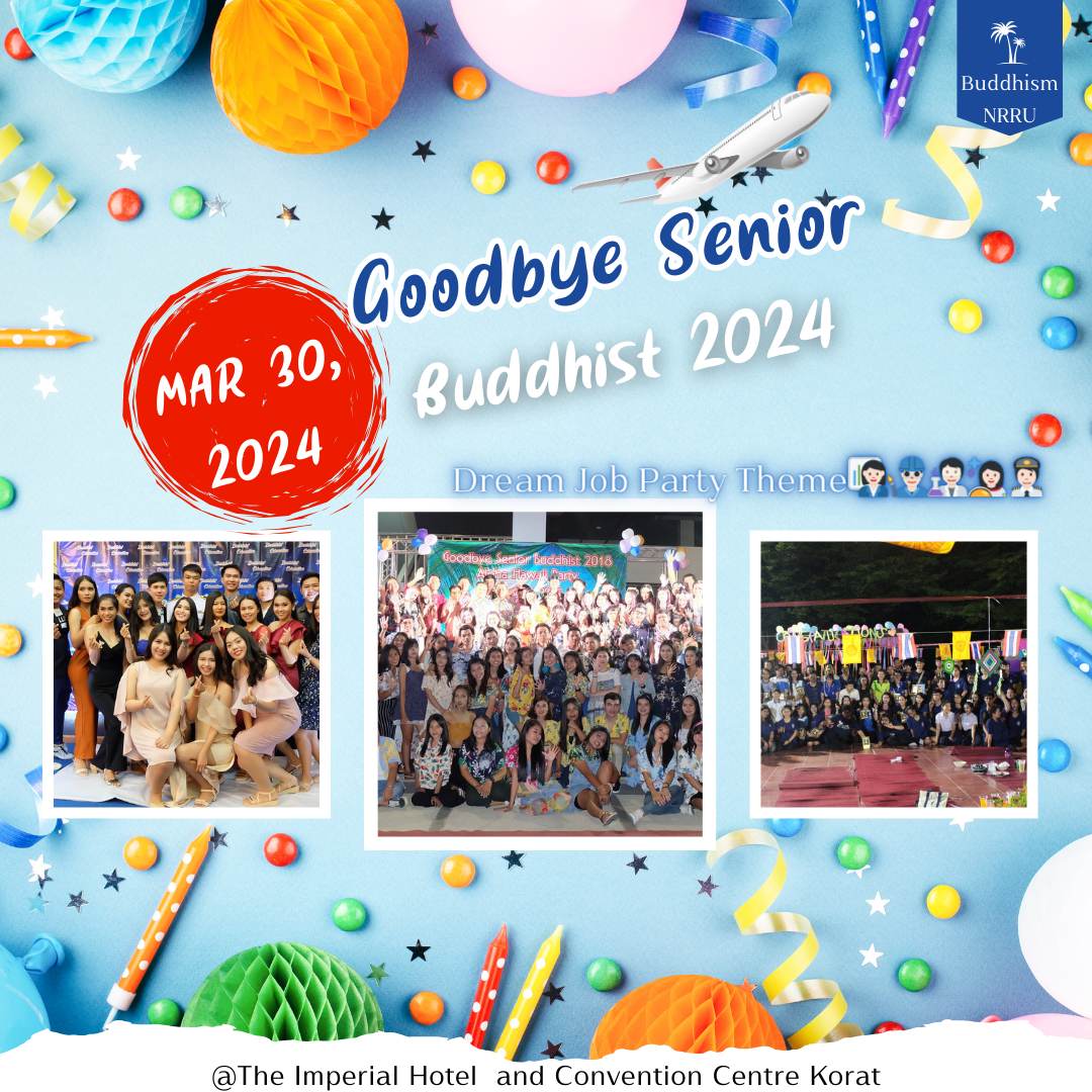 เชิญร่วมกิจกรรม Goodbye Senior Buddhist 2024 เพื่อเป็นการร่วมเลี้ยงอำลา และแสดงความยินดีกับรุ่นพี่ที่กำลังจะสำเร็จการศึกษาในชั้นปีสุดท้าย งานบายเนียร์ถือเป็นอีกงานหนึ่งที่มีความสำคัญคือการทำให้นักศึกษาชั้นปีสุดท้ายได้หวนระลึกถึงการใช้ชีวิตอยู่ในรั้วมหาวิทยาลัย ที่มีทั้งความสุข และความทุกข์ปะปนกันไปตลอดระยะเวลา 4 ปีที่ผ่านมา และยังเป็นการเปิดโอกาสให้รุ่นพี่ที่กำลังสำเร็จการศึกษาได้กล่าวคำอำลาและกล่าวความรู้สึกที่มีต่อเพื่อนๆ และรุ่นน้องอย่างเป็นทางการ ท่ามกลางบรรยากาศงานเลี้ยงที่อบอุ่นและเป็นกันเองของรุ่นพี่และรุ่นน้องร่วมทั้งคณาจารย์ในสาขาวิชาพุทธศาสนศึกษา เชิญร่วมกิจกรรมส่งพี่ให้ถึงฝันกู๊ดบายซีเนียร์ หลักสูตรครุศาสตรบัณฑิต สาขาวิชาพุทธศาสนศึกษา คณะครุศาสตร์ มหาวิทยาลัยราชภัฏนครราชสีมา สาขาวิชาพุทธศาสนศึกษารุ่นที่ 9 ในวันเสาร์ที่ 30 มีนาคม 2567 ณ โรงแรมดิ อิมพีเรียล โฮเทล แอนด์ คอนเวนชั่น เซ็นเตอร์ โคราช ตั้งแต่เวลา 17.30 น. เป็นต้นไป