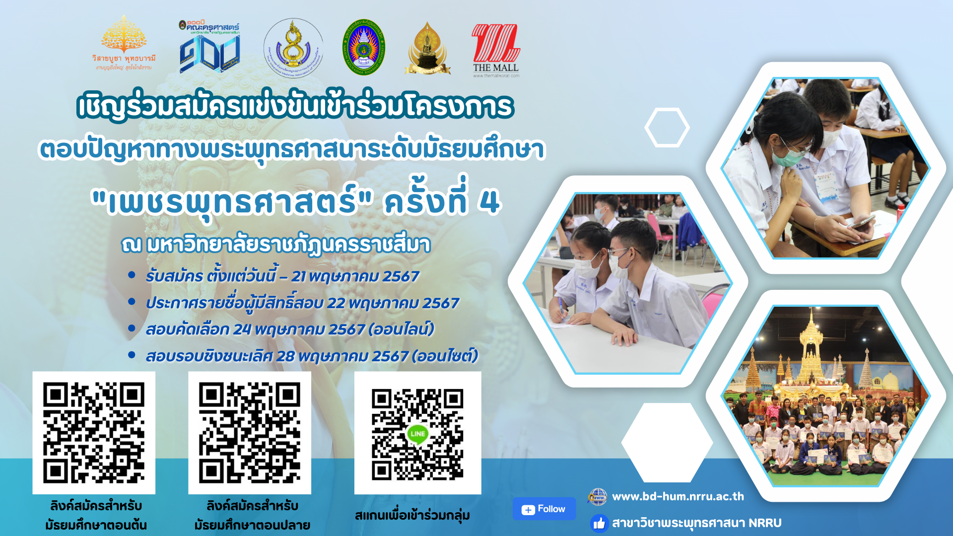 หลักสูตรครุศาสตรบัณฑิต สาขาวิชาพระพุทธศาสนา มหาวิทยาลัยราชภัฏนครราชสีมา เชิญสมัครแข่งขันโครงการตอบปัญหาทางพระพุทธศาสนาระดับมัธยมศึกษา “เพชรพุทธศาสตร์” ครั้งที่ 4 ประจำปีการศึกษา 2567 ชิงทุนการศึกษา 20,000 บาท รอบคัดเลือกสอบออนไลน์ รอบชิงชนะเลิศสอบออนไซต์ (หนึ่งโรงเรียนสามารถส่งนักเรียนเข้าแข่งขันได้ 2 ระดับ ระดับละ 2 ทีม ๆ ละ 2 คนเท่านั้น) ลิงก์สมัครเข้าร่วมการแข่งขัน