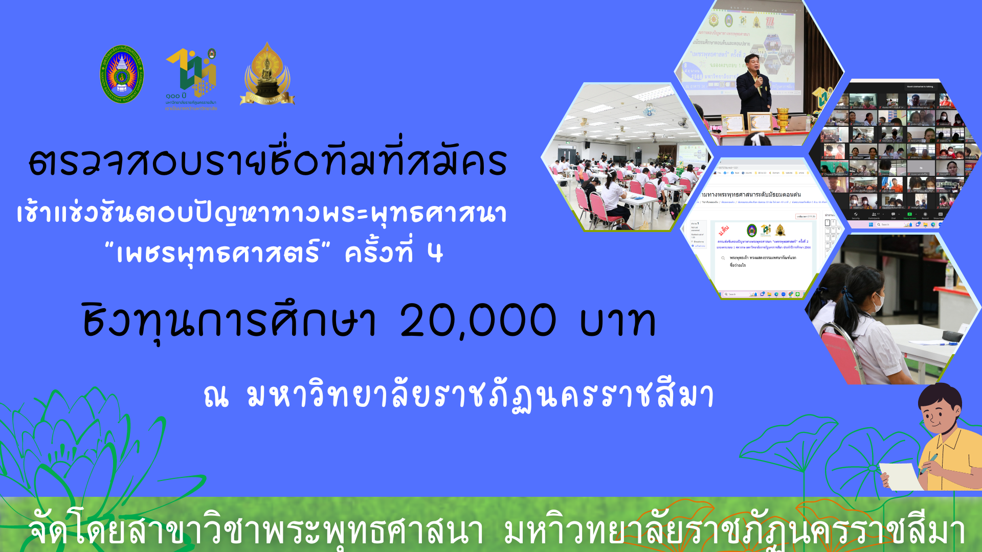 ตรวจสอบรายชื่อผู้สมัครเข้าแข่งขันตอบปัญหาทางพระพุทธศาสนาระดับมัธยมศึกษา “เพชรพุทธศาสตร์” ครั้งที่ 4 ชิงทุนการศึกษา 20,000 บาท ณ มหาวิทยาลัยราชภัฏนครราชสีมา ดังต่อไปนี้