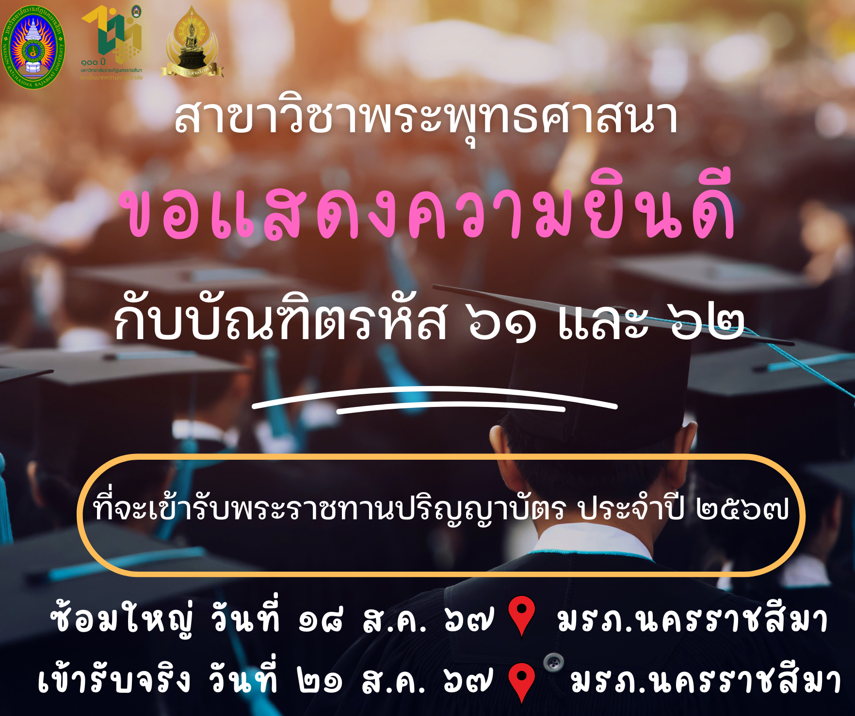 ☸️สาขาวิชาพระพุทธศาสนา มหาวิทยาลัยราชภัฏนครราชสีมา แสดงความยินดีกับบัณฑิต 👩🎓🧑🎓 รหัส ๖๑ และ ๖๒ ที่จะเข้ารับพระราชทานปริญญาบัตร ประจำปีการศึกษา ๒๕๖๕ โดยกำหนดพิธีซ้อมใหญ่ในวันอาทิตย์ ที่ ๑๘ สิงหาคม ๒๕๖๗ และเข้ารับพระราชทานปริญญาบัตรจริง วันพุธ ที่ ๒๑ สิงหาคม ๒๕๖๗ ณ หอประชุมราชภัฏรังสฤษฏ์ มหาวิทยาลัยราชภัฏนครราชสีมา ด้วยความยินดียิ่ง … 🎉🎉🎉