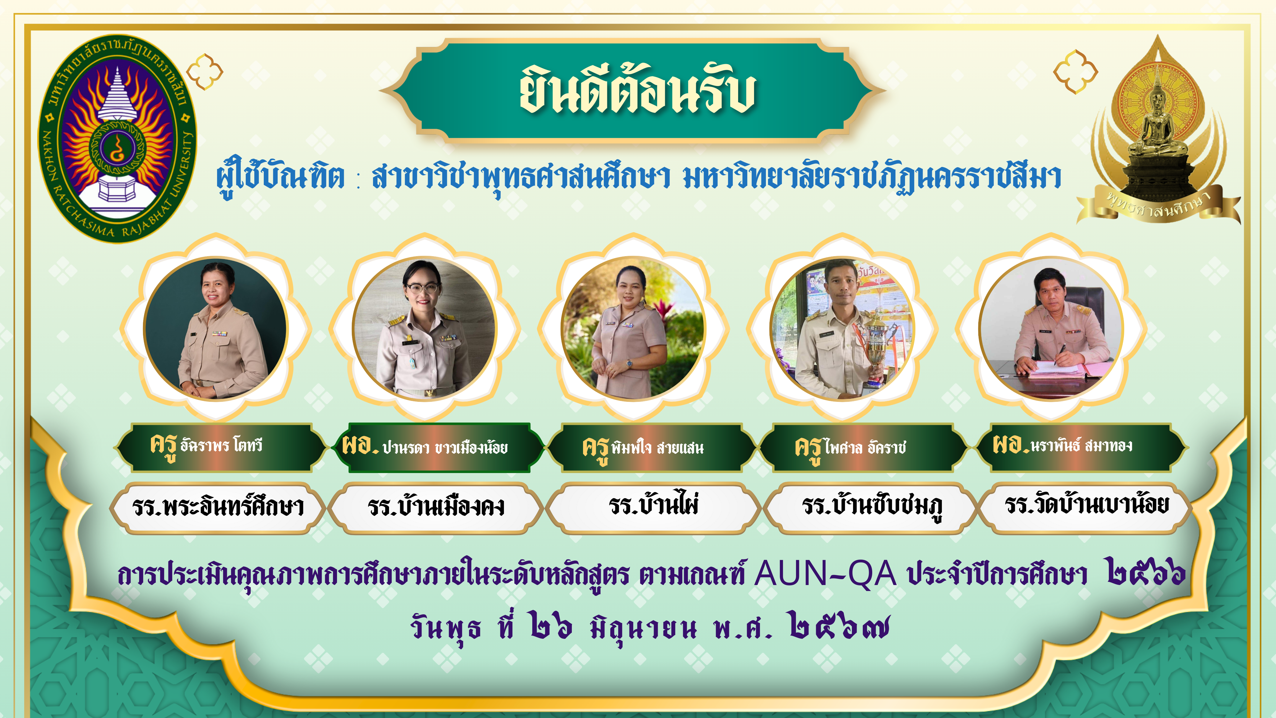 หลักสูตรครุศาสตรบัณฑิต สาขาวิชาพระพุทธศาสนา มหาวิทยาลัยราชภัฏนครราชสีมา ยินดีต้อนรับผู้ใช้บัณฑิตและตัวแทนศิษย์เก่าสาขาวิชาพุทธศาสนศึกษา ในการตรวจประเมินคุณภาพการศึกษาภายในระดับหลักสูตร ตามเกณฑ์ AUN-QA ประจำปีการศึกษา 2566 วันพุธ ที่ 26 มิถุนายน พ.ศ. 2567 ซึ่งประกอบด้วย