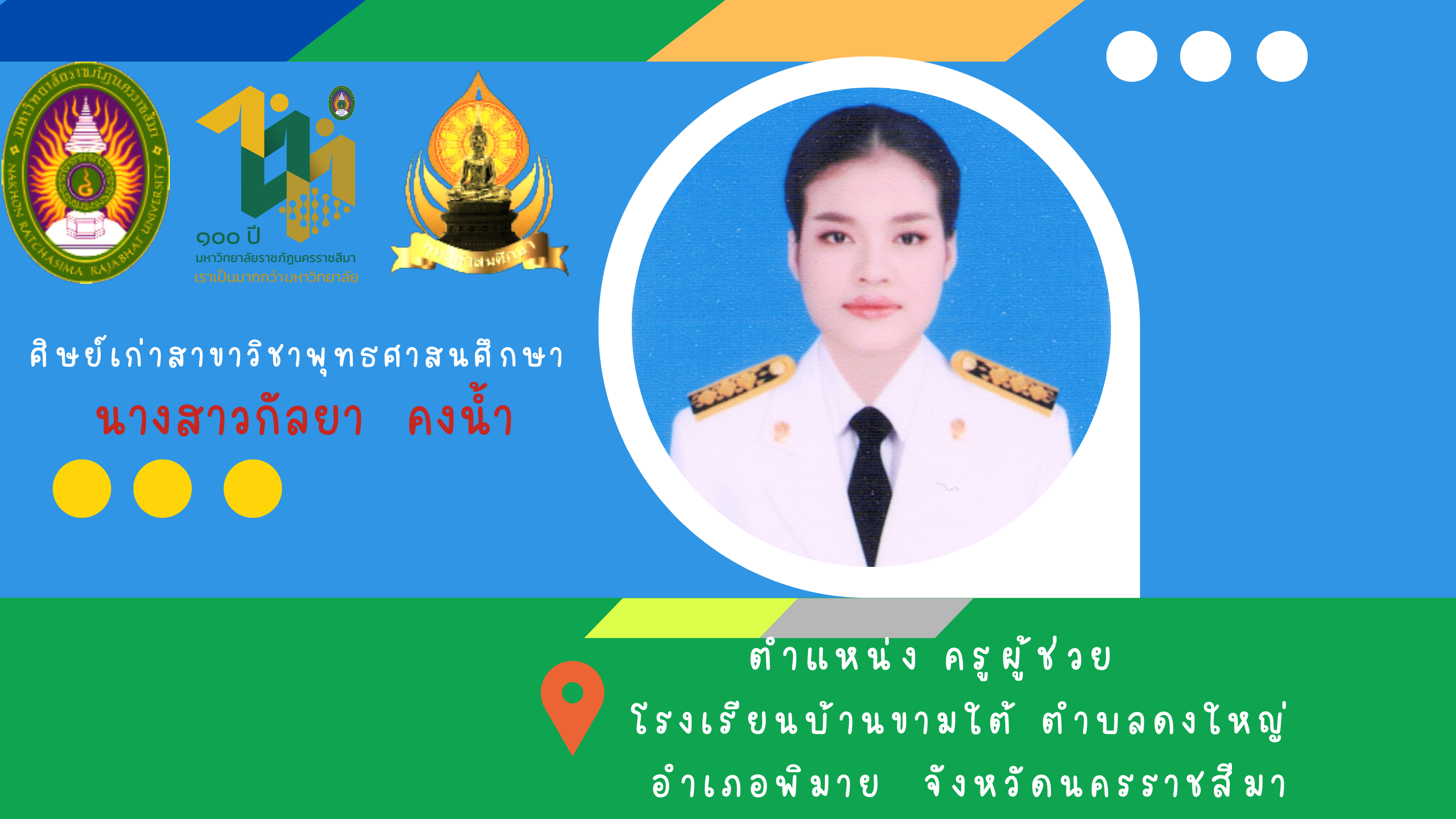 สาขาวิชาพระพุทธศาสนา มหาวิทยาลัยราชภัฏนครราชสีมา ขอแสดงความยินดีกับนางสาวกัลยา คงน้ำ (ครูบีม) ศิษย์เก่าสาขาวิชาพุทธศาสนศึกษา (หลักสูตรเดิม) ที่ได้รับการบรรจุและแต่งตั้งจากการสอบแข่งขันได้ เพื่อบรรจุและแต่งตั้งบุคคลเข้ารับราชการ เป็นข้าราชการครูและบุคลากรทางการศึกษา ตำแหน่ง ครูผู้ช่วย สังกัดสำนักงานเขตพื้นที่การศึกษาประถมศึกษานครราชสีมา เขต 7 เลือกบรรจุเป็นข้าราชการครู ณ โรงเรียนบ้านขามใต้ ตำบลดงใหญ่ อำเภอพิมาย จังหวัดนครราชสีมา สังกัด สพป.นครราชสีมา เขต 7 รายงานตัวปฏิบัติหน้าที่ในวันที่ 1 กรกฎาคม 2567 ด้วยความยินดียิ่ง