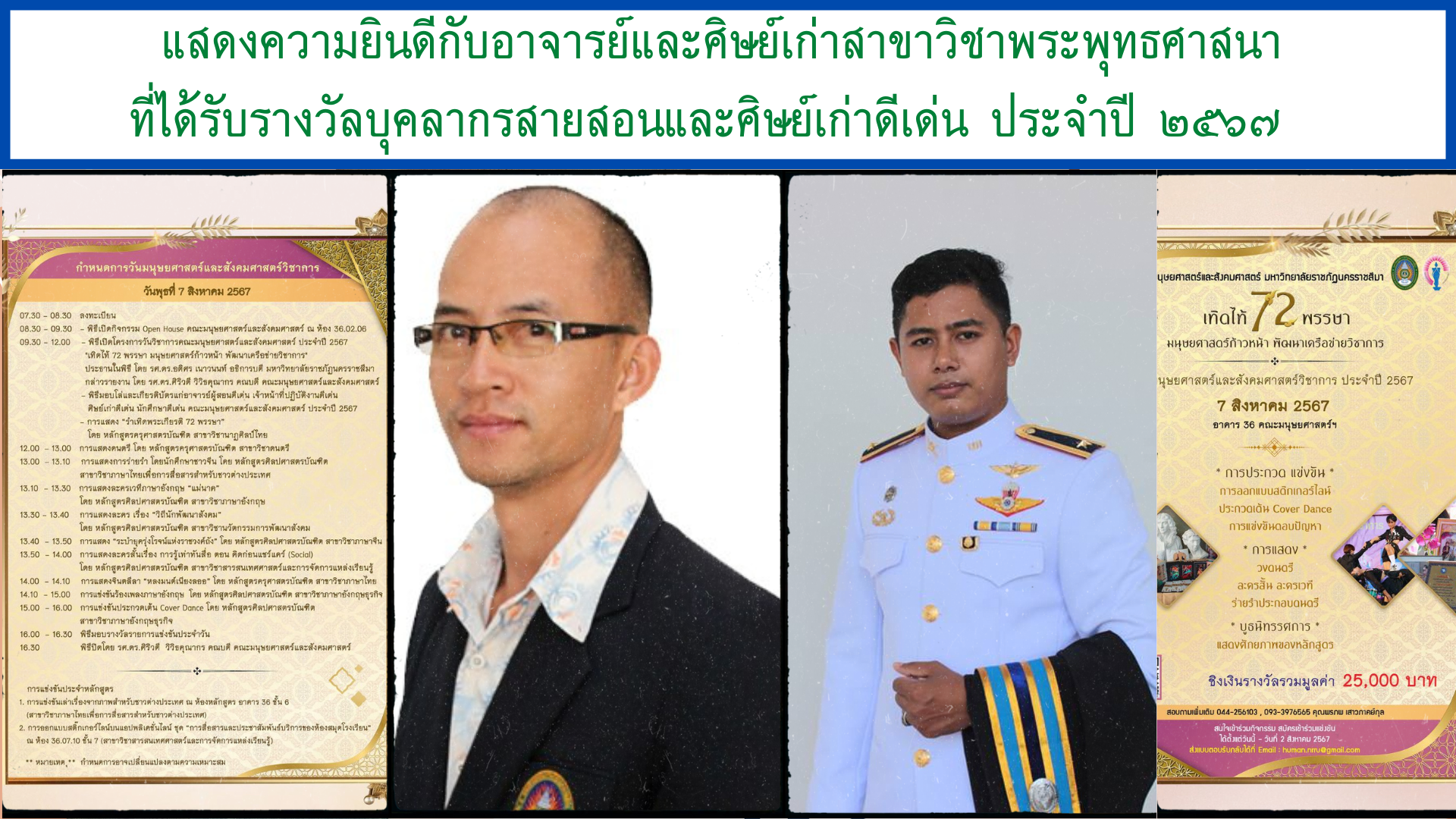 ด้วยคณะมนุษยศาสตร์และสังคมศาสตร์ มหาวิทยาลัยราชภัฎนครราชสีมา ได้กำหนดจัดโครงการวันวิชาการคณะมนุษยศาสตร์และสังคมศาสตร์ ประจำปี ๒๕๖๗ ภายใต้ชื่อ “เทิดให้ ๗๒ พรรษามนุษยศาสตร์ก้าวหน้า พัฒนาเครือข่ายวิชาการ” ในวันพุธ ที่ ๗ สิงหาคม ๒๕๖๗ ณ อาคารคณะมนุยศาสตร์และสังคมศาสตร์ (อาคาร ๓๖) และได้กำหนดให้มีการประกาศเกียรติคุณแก่ผู้มีความรู้ความสามารถ มีศักยภาพและอุทิศตนสร้างประโยชน์ให้แก่สังคม ครอบคลุมทั้งงานภาครัฐและภาคเอกชน ตลอดทั้งเป็นผู้ที่มีการครองตน ครองคน ครองานได้อย่างดีเยี่ยม ซึ่งถือเป็นผู้ที่ได้สร้างเกียรติยศชื่อเสียงและสร้างคุณประโยชน์ให้แก่คณะมนุษยศาสตร์และสังคมศาสตร์ และมหาวิทยาลัยราชภัฎนครราชสีมาอย่างแท้จริง โดยมีอาจารย์และศิษย์เก่าของสาขาวิชาพระพุทธศาสนาได้รับรางวัลบุคลากรสายสอนและศิษย์เก่าดีเด่น ประจำปี ๒๕๖๗ จำนวนอย่างละ ๑ รางวัล ได้แก่
