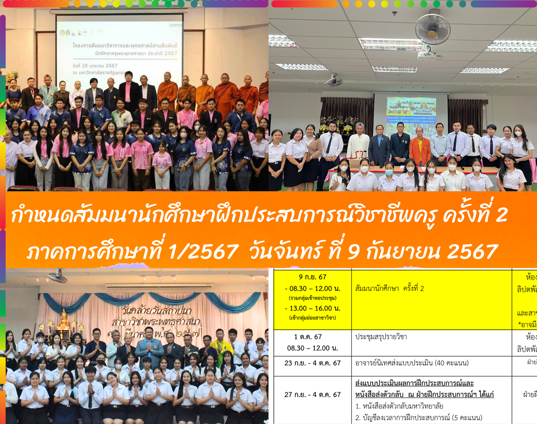 กำหนดจัดสัมมนาครั้งที่ 2 วันที่ 9 กันยายน 2567 นักศึกษาฝึกประสบการณ์สอนวิชาชีพครู ชั้นปีที่ 4 ภาคเรียนที่ 1/2567 หลักสูตรครุศาสตรบัณฑิต สาขาวิชาพุทธศาสนศึกษา มหาวิทยาลัยราชัภกนครราชสีมา ภาคเช้าสัมมนาโดยฝ่ายฝึกประสบการณ์วิชาชีพ คณะครุศาสตร์ ณ ห้องประชุมสุวัจน์ลิปตพัลลภ 3 อาคาร 31 และภาคบ่ายของสาขาวิชา ณ อาคาร 36 ห้อง 36.05.06 เพื่อให้คณาจารย์และนักศึกษาร่วมแลกเปลี่ยนประสบการณ์จากการฝึกสอนของนักศึกษาสาขาวิชาพุทธศาสนศึกษา ชั้นปีที่ 4 ประจำภาคการศึกษาที่ 1/2567 โดยกำหนดหัวข้อในการสัมมนา 4 ประเด็นก็คือ