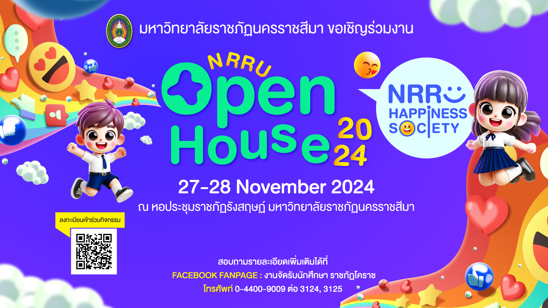 มหาวิทยาลัยราชภัฏนครราชสีมา ขอเชิญร่วมงาน NRRU Open House 2024 “NRRU Happiness Society” ในวันที่ 27-28 พฤศจิกายน 2567 เวลา 08.30 – 16.00 น. ณ หอประชุมราชภัฏรังสฤษฏ์ มหาวิทยาลัยราชภัฏนครราชสีมา