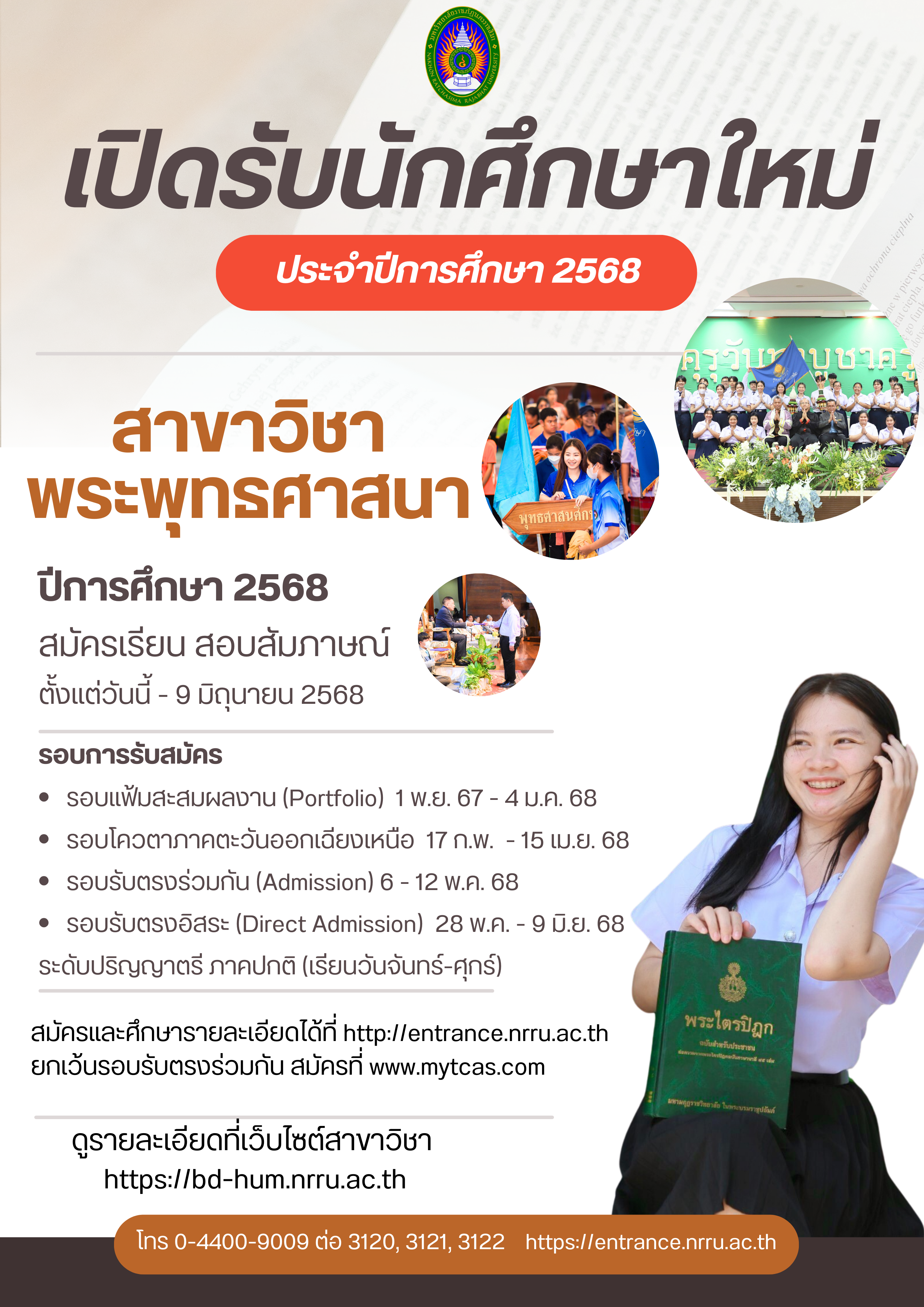 สาขาวิชาพระพุทธศาสนา มหาวิทยาลัยราชภัฏนครราชสีมา เปิดรับสมัครนักศึกษาใหม่ ประจำปีการศึกษา 2568 ระหว่างวันที่ 1 พฤศจิกายน 2567 – 9 มิถุนายน 2568 ซึ่งมีรายละเอียดการรับสมัครดังต่อไปนี้