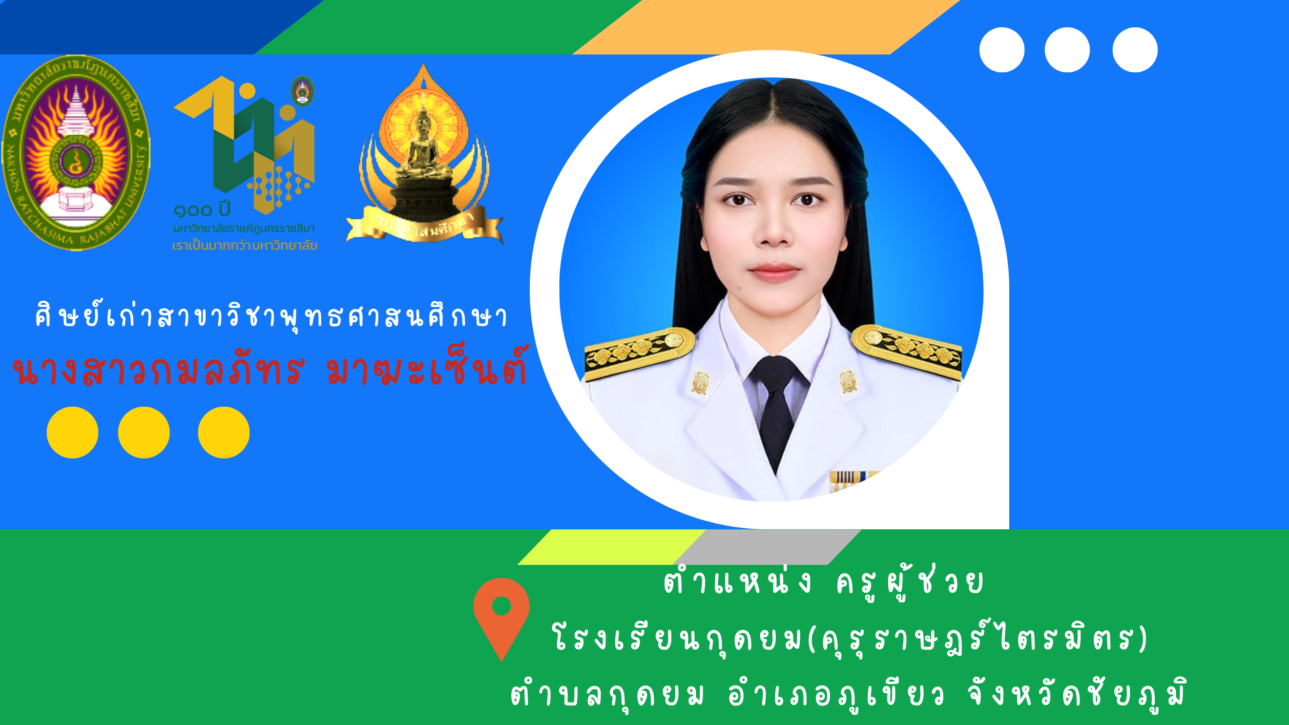 สาขาวิชาพระพุทธศาสนา มหาวิทยาลัยราชภัฏนครราชสีมา ขอแสดงความยินดีกับนางสาวกมลภัทร มาฆะเซ็นต์ (ครูเนย) ศิษย์เก่าสาขาวิชาพุทธศาสนศึกษา (หลักสูตรเดิม) ที่ได้รับการบรรจุและแต่งตั้งจากการสอบแข่งขันได้ เพื่อบรรจุและแต่งตั้งบุคคลเข้ารับราชการ เป็นข้าราชการครูและบุคลากรทางการศึกษา ตำแหน่ง ครูผู้ช่วย สังกัดสำนักงานเขตพื้นที่การศึกษาประถมศึกษาชัยภูมิ เขต 2 เลือกบรรจุเป็นข้าราชการครู ณ โรงเรียนกุดยม (คุรุราษฎร์ไตรมิตร) ตำบลกุดยม อำเภอภูเขียว จังหวัดชัยภูมิ รายงานตัวปฏิบัติหน้าที่ในวันที่ 22 พฤศจิกายน 2567
