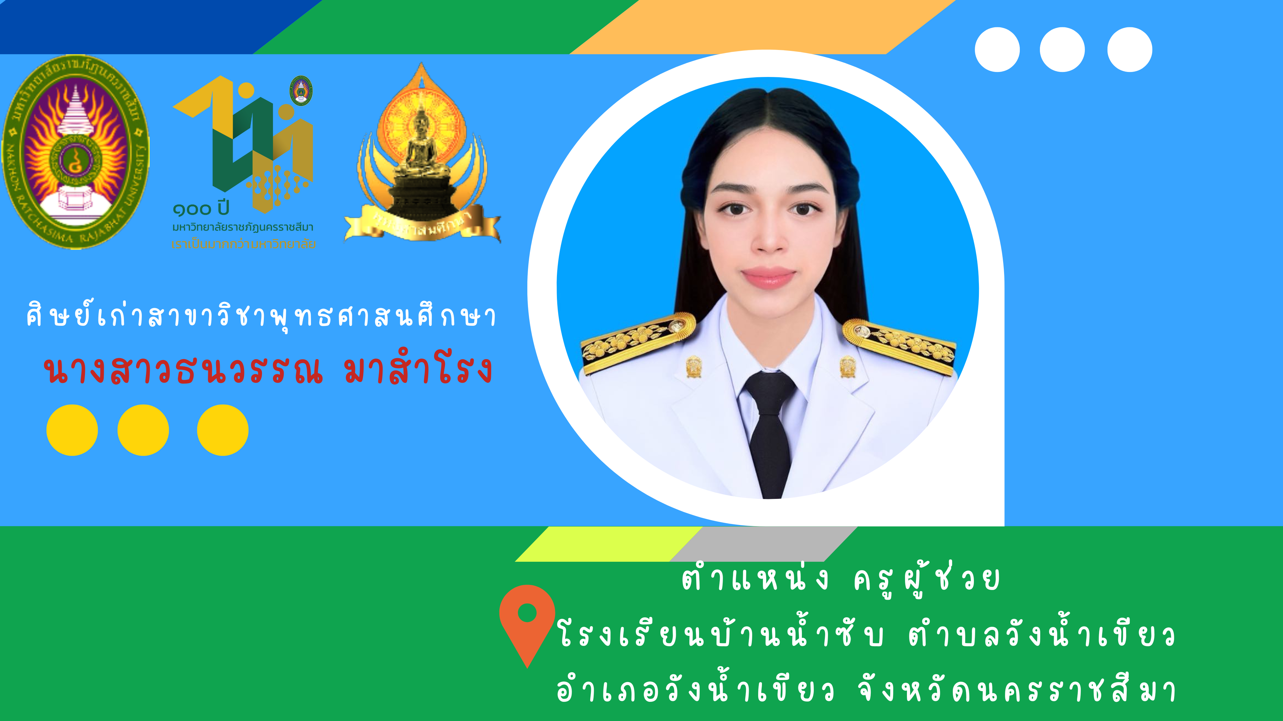สาขาวิชาพระพุทธศาสนา มหาวิทยาลัยราชภัฏนครราชสีมา ขอแสดงความยินดีกับนางสาวธนวรรณ มาสำโรง (ครูทาย) ศิษย์เก่าสาขาวิชาพุทธศาสนศึกษา (หลักสูตรเดิม) ที่ได้รับการบรรจุและแต่งตั้งจากการสอบแข่งขันได้ เพื่อบรรจุและแต่งตั้งบุคคลเข้ารับราชการ เป็นข้าราชการครูและบุคลากรทางการศึกษา ตำแหน่ง ครูผู้ช่วย สังกัดสำนักงานเขตพื้นที่การศึกษาประถมศึกษานครราชสีมา เขต 3 เลือกบรรจุเป็นข้าราชการครู ณ โรงเรียนบ้านน้ำซับ ตำบลวังน้ำเขียว อำเภอวังน้ำเขียว จังหวัดนครราชสีมา รายงานตัวปฏิบัติหน้าที่ในวันที่ 24 ธันวาาคม 2567