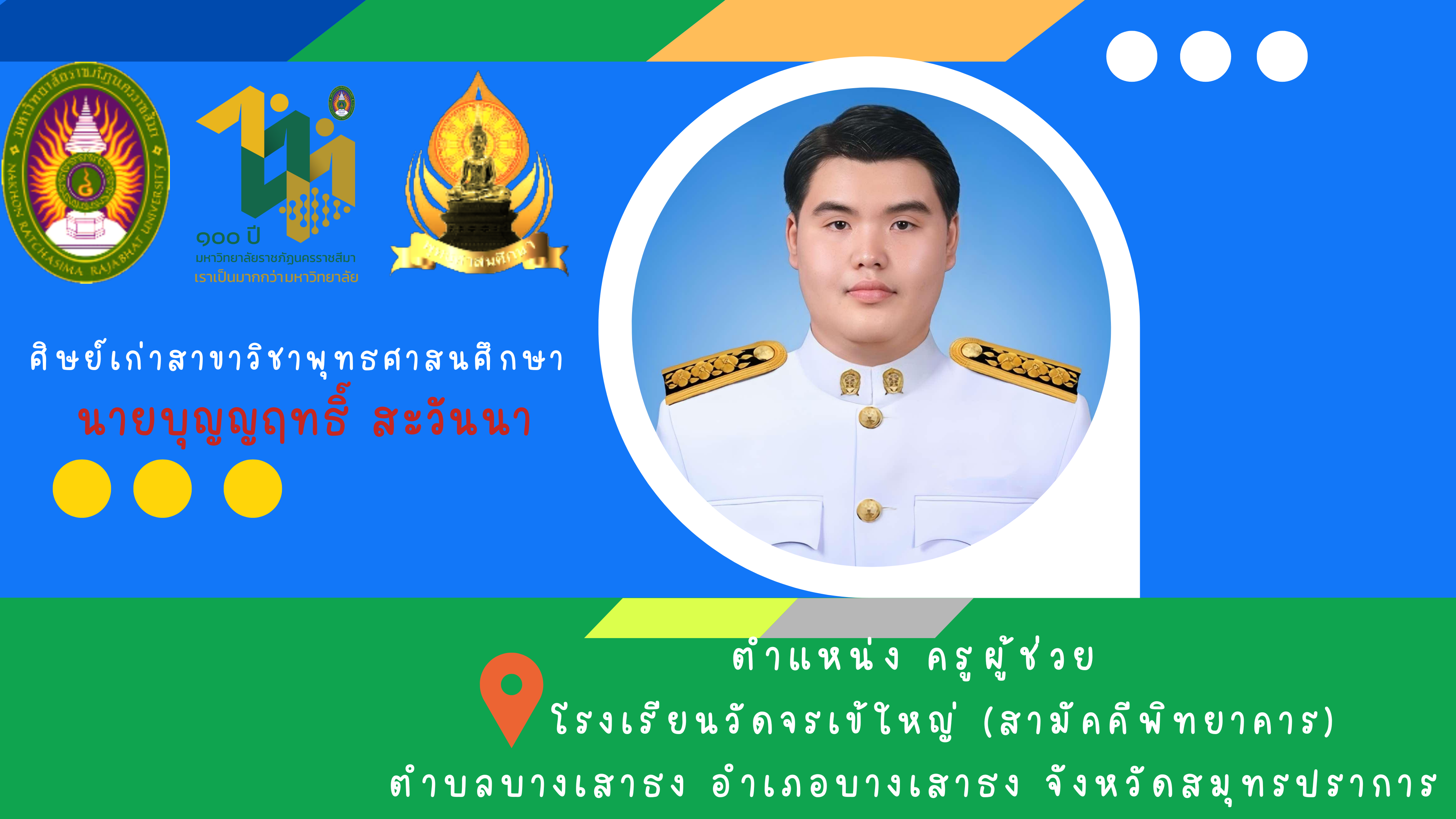 สาขาวิชาพระพุทธศาสนา มหาวิทยาลัยราชภัฏนครราชสีมา ขอแสดงความยินดีกับนายบุญญฤทธิ์ สะวันนา (ครูปลื้ม) ศิษย์เก่าสาขาวิชาพุทธศาสนศึกษา (หลักสูตรเดิม) ที่ได้รับการบรรจุและแต่งตั้งจากการสอบแข่งขันได้ เพื่อบรรจุและแต่งตั้งบุคคลเข้ารับราชการ เป็นข้าราชการครูและบุคลากรทางการศึกษา ตำแหน่ง ครูผู้ช่วย สังกัดสำนักงานเขตพื้นที่การศึกษาประถมศึกษาสมุทรปราการ เขต 2 เลือกบรรจุเป็นข้าราชการครู ณ โรงเรียนวัดจรเข้ใหญ่ (สามัคคีพิทยาคาร) ตำบลบางเสาธง อำเภอบางเสาธง จังหวัดสมุทรปราการ รายงานตัวปฏิบัติหน้าที่ในวันที่ 26 ธันวาาคม 2567