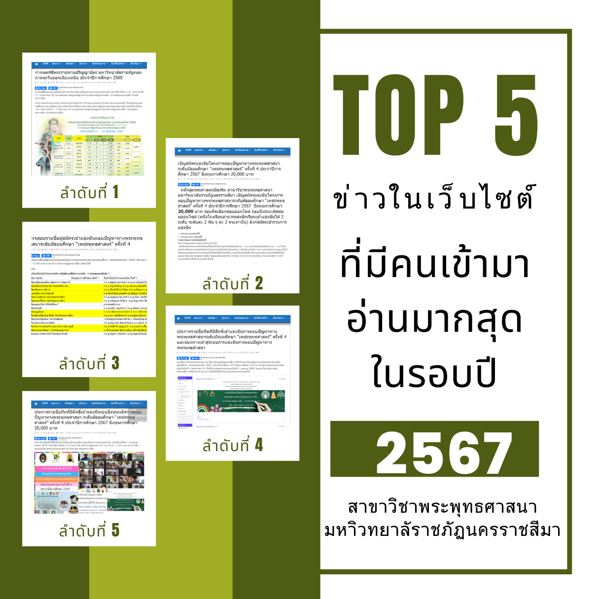 ในปีพุทธศักราช 2566 เว็บไซต์สาขาวิชาพระพุทธศาสนา ได้นำเสนอข่าวทั้งสิ้นจำนวน 97 เรื่องในเว็บไซต์ โดยข่าวที่มีคนเข้ามาอ่านมากสุดในรอบปี 2567 จำนวน 5 ลำดับแรกประกอบไปด้วยข่าวดังต่อไปนี้