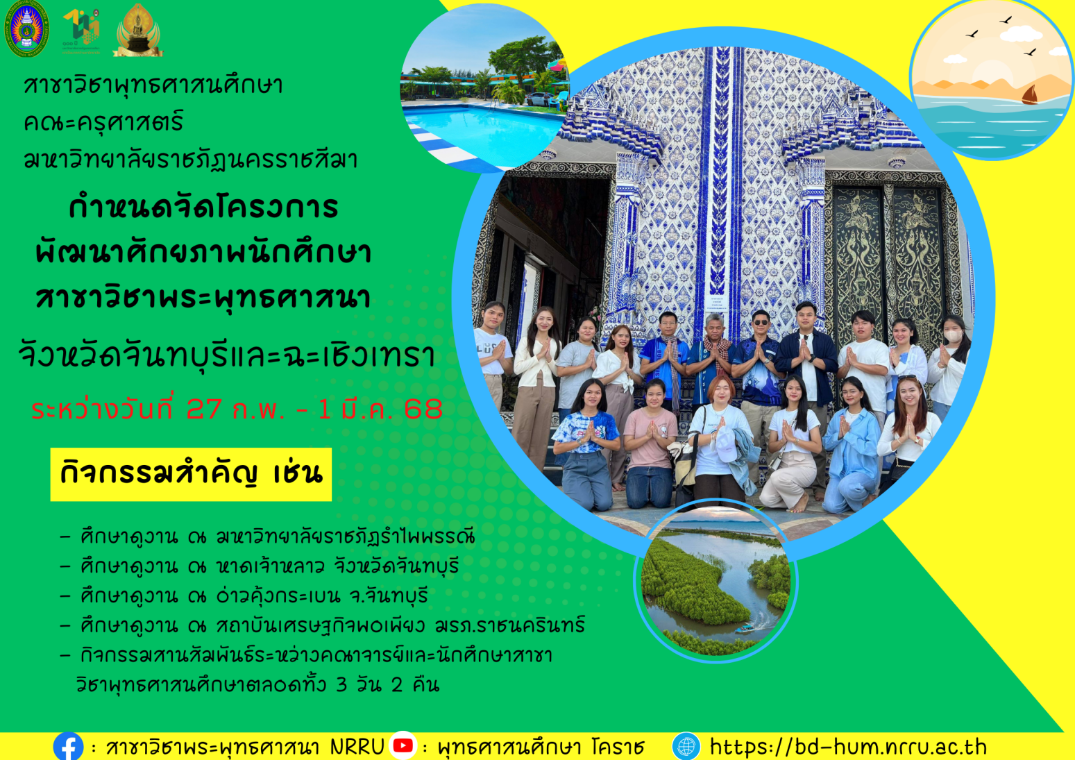 สาขาวิชาพุทธศาสนศึกษา คณะครุศาสตร์ มหาวิทยาลัยราชภัฏนครราชสีมา กำหนดจัดโครงการพัฒนาศักยภาพนักศึกษาสาขาวิชาพระพุทธศาสนา ณ จังหวัดจันทบุรีและฉะเชิงเทรา ระหว่างวันที่ 27 กุมภาพันธ์ – 1 มีนาคม 2568 ร่วมกิจกรรมสำคัญ เช่น
