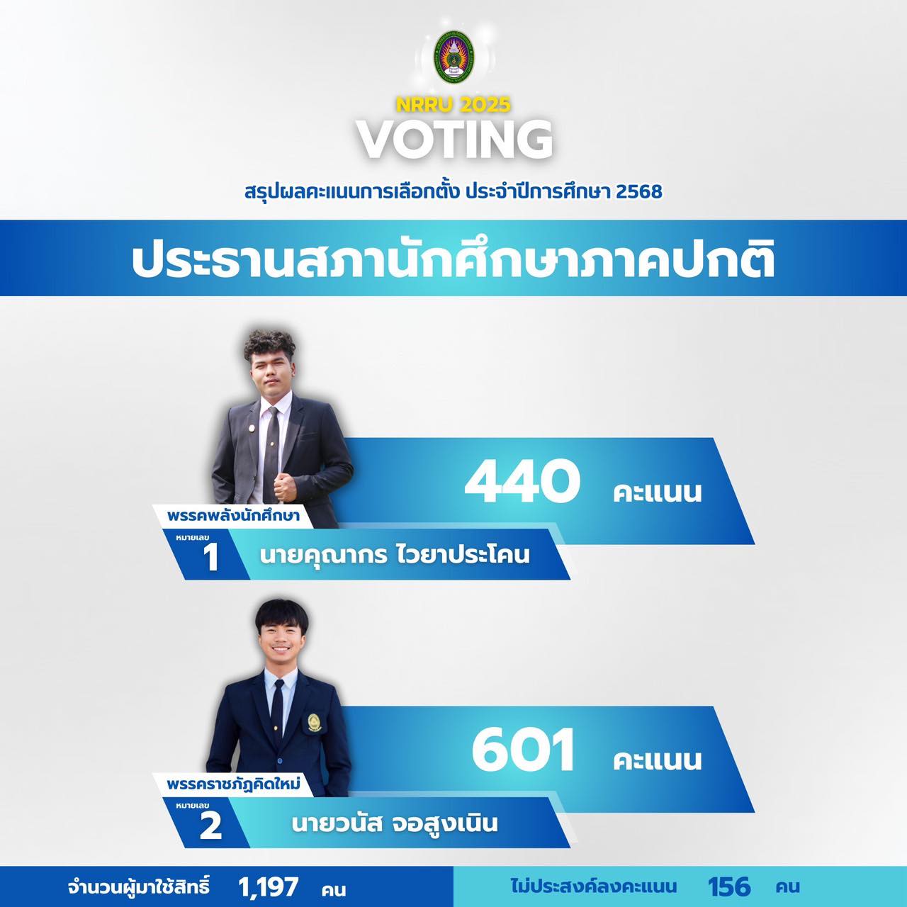 โดยผลการเลือกตั้งนายวนัส จอสูงเนิน นักศึกษาสาขาวิชาพุทธศาสนศึกษา คณะครุศาสตร์ ผู้สมัครหมายเลข 2 สังกัดพรรคราชภัฏคิดใหม่ ได้คะแนน 601 คะแนน ซึ่งเป็นคะแนนสูงสุดในการเลือกตั้งประธานสภานักศึกษาภาคปกติในครั้งนี้ และจะได้ทำหน้าที่เป็นประธานนักศึกษาภาคปกติ มหาวิทยาลัยราชภัฏนครราชสีมา ประจำปีการศึกษา 2568 ต่อไป