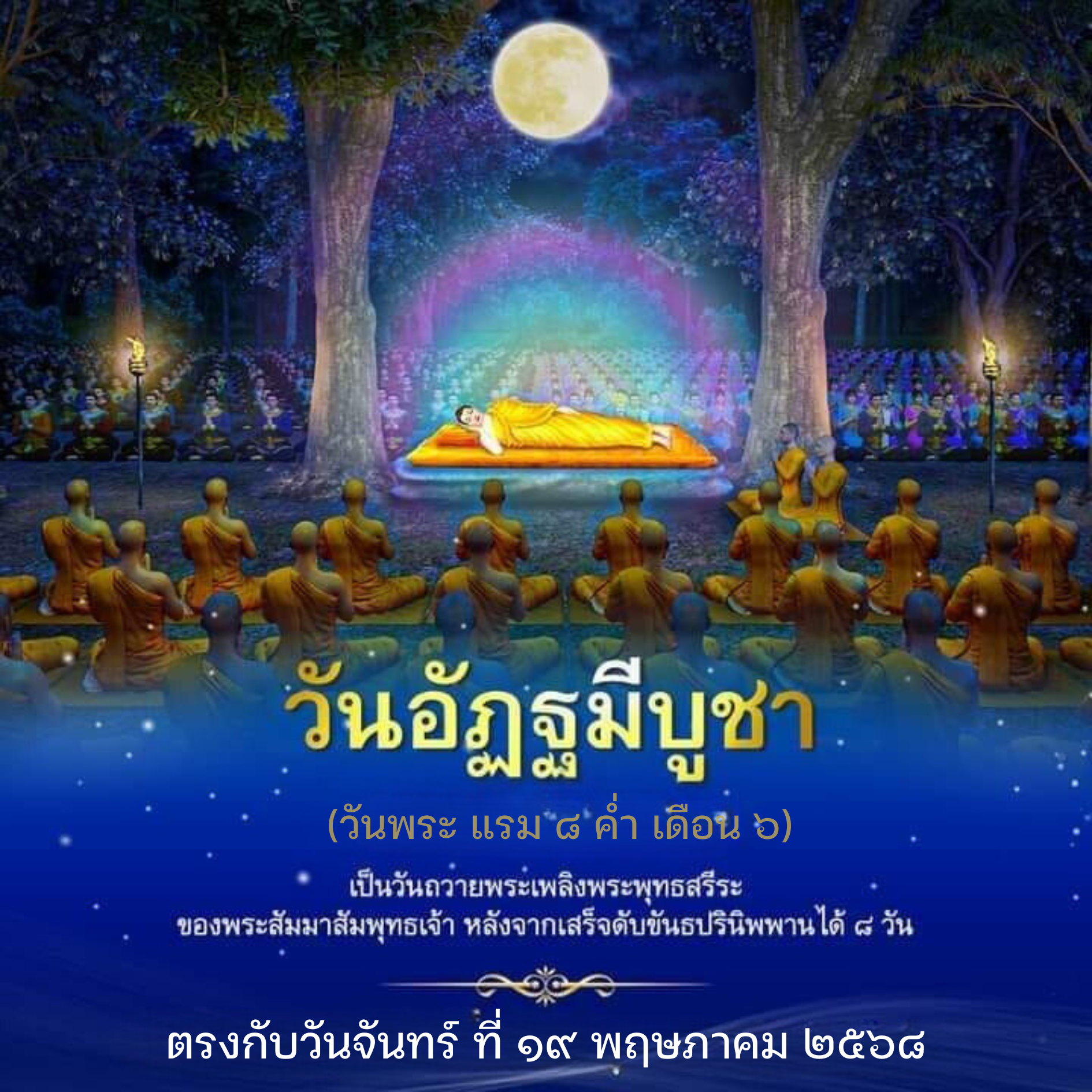 วันอัฏฐมีบูชา (อ่านว่า “อัด-ถะ-มี-บู-ชา”) เป็นวันสำคัญทางพุทธศาสนา ที่ระลึกถึง วันที่พระพุทธเจ้าเสด็จดับขันธปรินิพพานแล้ว 8 วัน (ตรงกับวันแรม 8 ค่ำ เดือนวิสาขะ หรือเดือน 6 ของไทย) ซึ่งเป็นวันที่ชาวเมืองกุสินาราได้ถวายพระเพลิงพระบรมศพพระพุทธเจ้า โดยถือเป็นวันสุดท้ายของเหตุการณ์ปรินิพพาน สำหรับปี พ.ศ. 2568 วันอัฏฐมีบูชาตรงกับวันจันทร์ ที่ 19 พฤษภาคม 2568