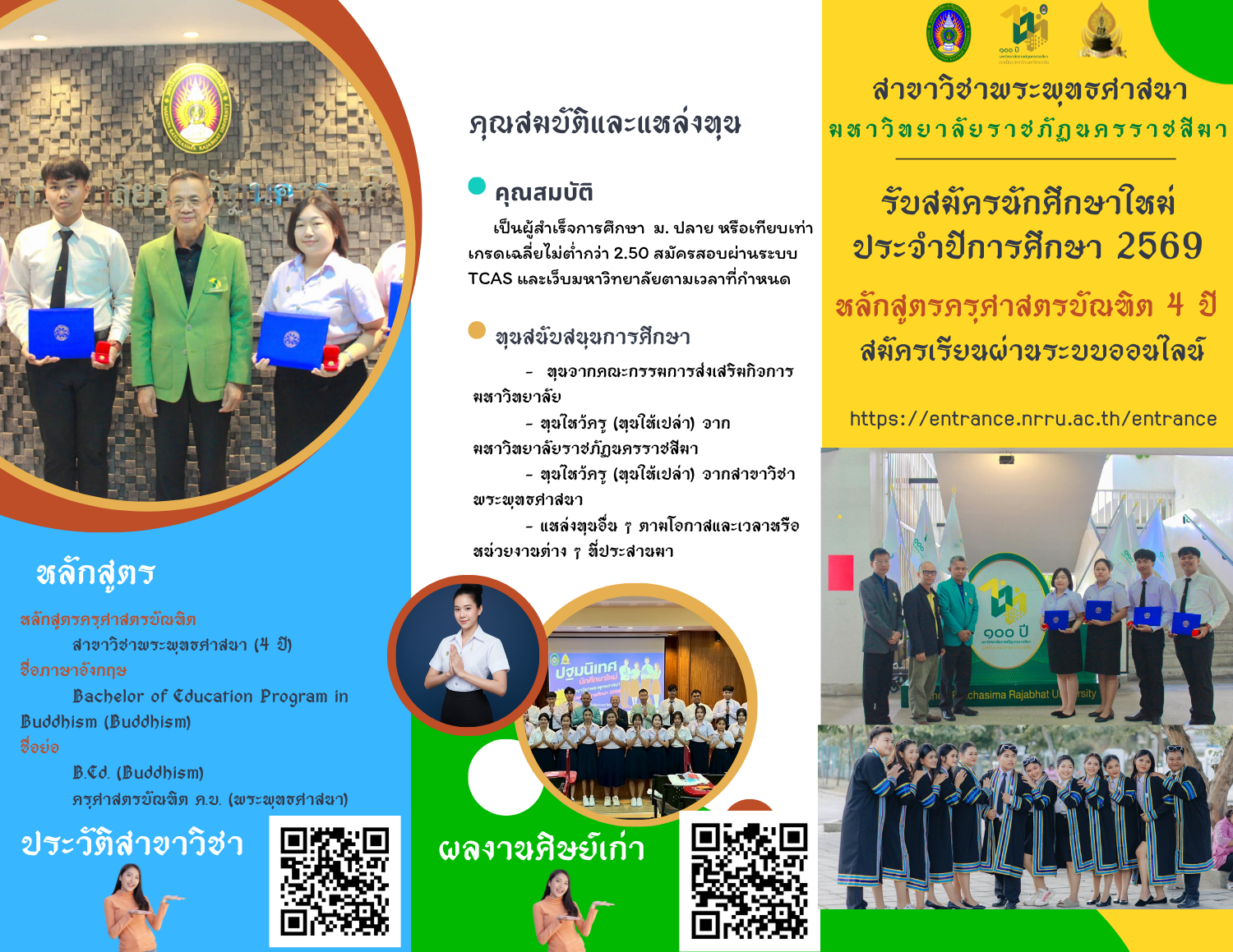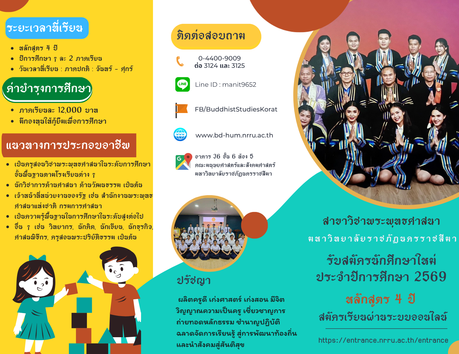 สาขาวิชาพระพุทธศาสนา มหาวิทยาลัยราชภัฏนครราชสีมา เปิดรับสมัครนักศึกษาใหม่ ประจำปีการศึกษา 2569 ระหว่างวันที่ 15 ตุลาคม 2568 – 6 มิถุนายน 2569 ซึ่งมีรายละเอียดการรับสมัครดังต่อไปนี้