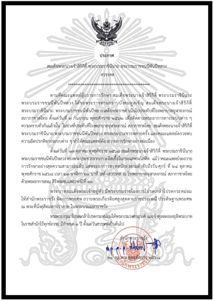 ตั้งแต่วันที่ ๑๗ ตุลาคม พุทธศักราช ๒๕๖๘ สมเด็จพระนางเจ้าสิริกิติ์ พระบรมราชินีนาถพระบรมราชชนนีพันปีหลวง ทรงพระประชวรจากภาวะติดเชื้อในกระแสพระโลหิต แม้ว่าคณะแพทย์จะถวายการรักษาอย่างสุดความสามารถแล้ว แต่พระอาการทรุดหนักลงตามลำดับ ถึงวันศุกร์ ที่ ๒๔ ตุลาคม พุทธศักราช ๒๕๖๘ เวลา ๒๑ นาฬิกา ๒๑ นาที เสด็จสวรรคต ณ โรงพยาบาลจุฬาลงกรณ์ สภากาชาดไทย ด้วยพระอาการสงบ สิริพระชนมพรรษาปีที่ ๙๓