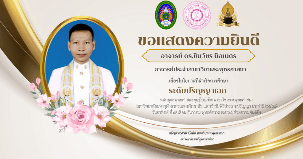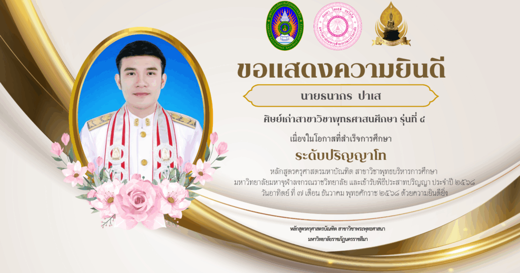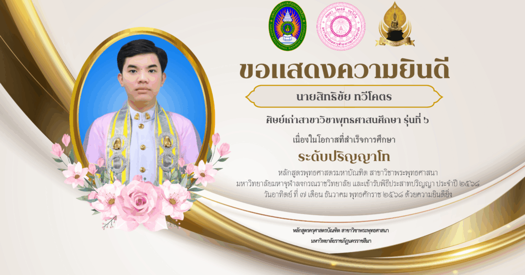 สาขาวิชาพระพุทธศาสนา แสดงความยินดีกับอาจารย์และศิษย์เก่าที่สำเร็จการศึกษาระดับบัณฑิตศึกษา จากมหาวิทยาลัยมหาจุฬาลงกรณราชวิทยาลัย และเข้าร่วมพิธีประสาทปริญญา ประจำปีพุทธศักราช ๒๕๖๘ ในวันอาทิตย์ที่ ๗ เดือนธันวาคม พุทธศักราช ๒๕๖๘ โดยมีผู้สำเร็จการศึกษารวมทั้งสิ้น ๓ คน ดังต่อไปนี้