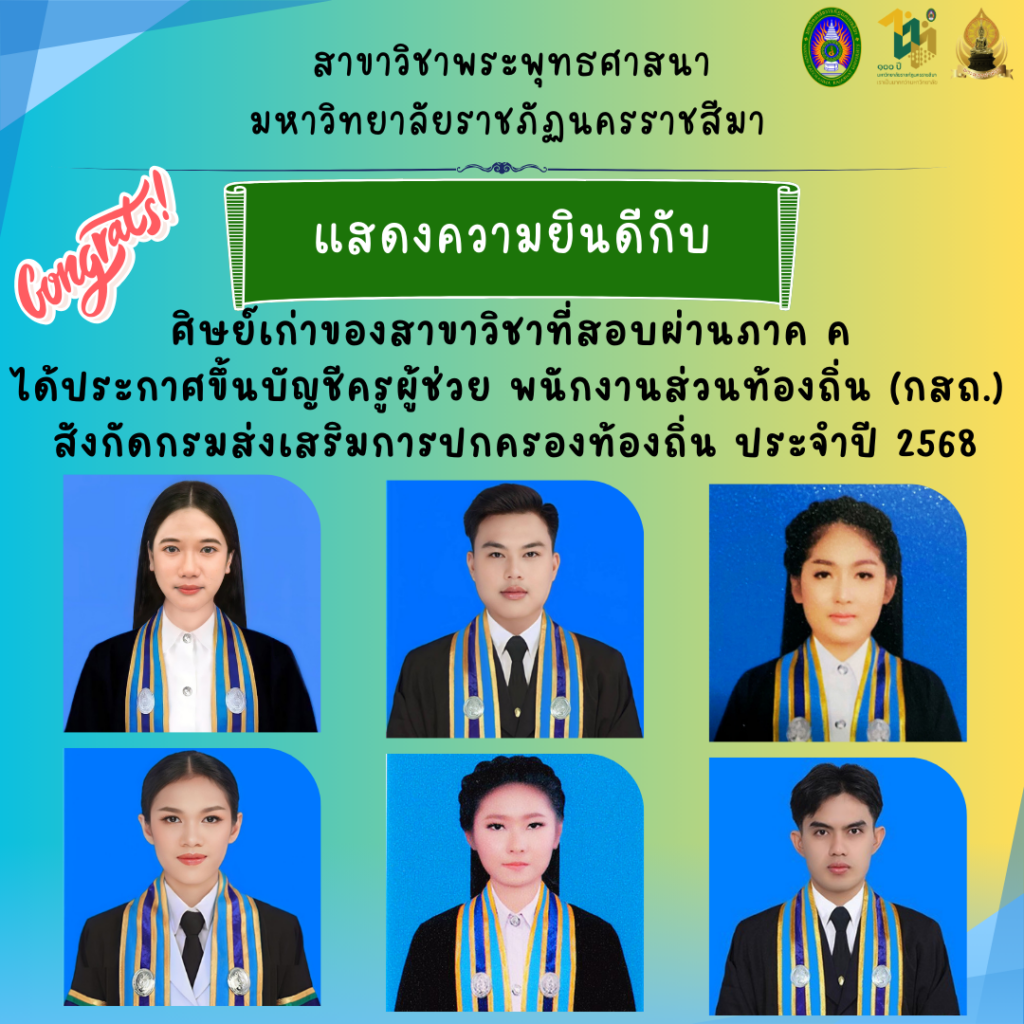 แสดงความยินดีกับศิษย์เก่าสาขาวิชาพระพุทธศาสนา ม.ราชภัฏโคราช ที่สอบผ่านขึ้นบัญชีครูผู้ช่วย สังกัดกรมส่งเสริมการปกครองท้องถิ่น ประจำปี 2568
