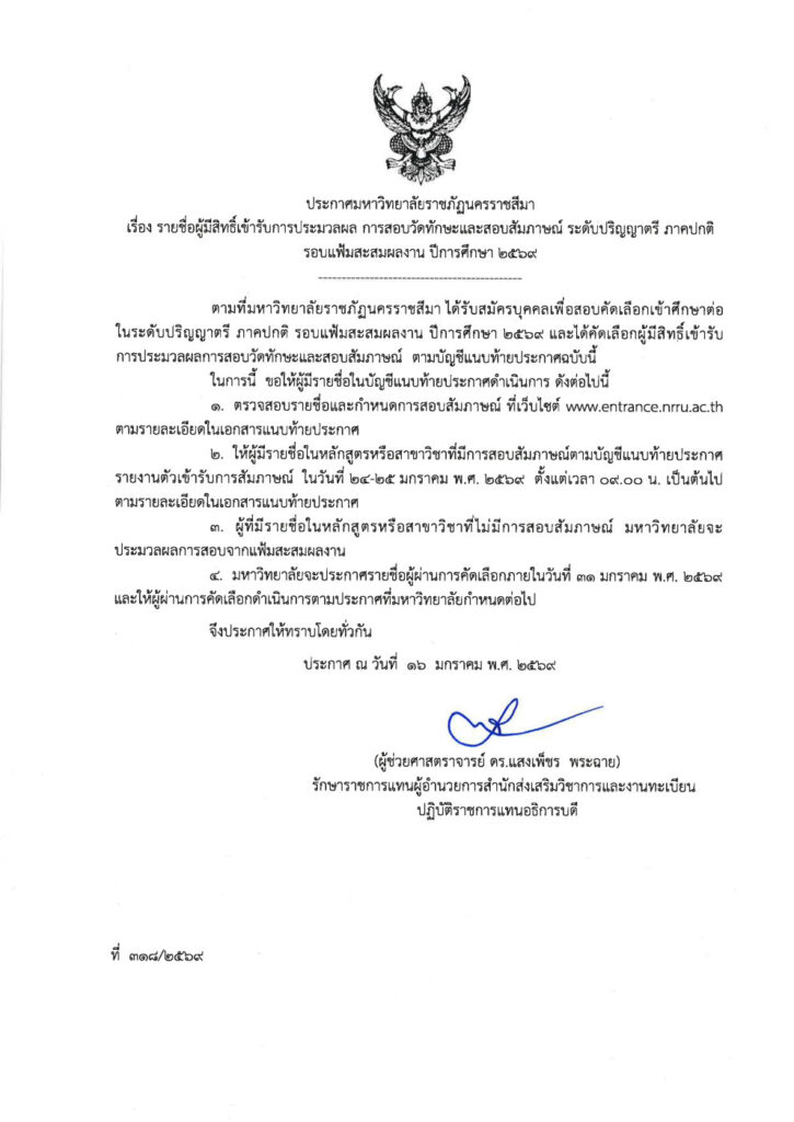ตามที่มหาวิทยาลัยราชภัฎนครราชสีมา ได้รับสมัครบุคคลเพื่อสอบคัดเลือกเข้าศึกษาต่อในระดับปริญญาตรี ภาคปกติ รอบแฟัมสะสมผลงาน ปีการศึกษา 2569 และได้มีผู้มีสิทธิ์เข้ารับการประมวลผลและสอบสัมภาษณ์ ตามบัญชีแนบท้ายประกาศฉบับนี้ในการนี้ ขอให้ผู้มีรายชื่อในบัญชีแนบท้ายประกาศดำเนินการ ดังต่อไปนี้