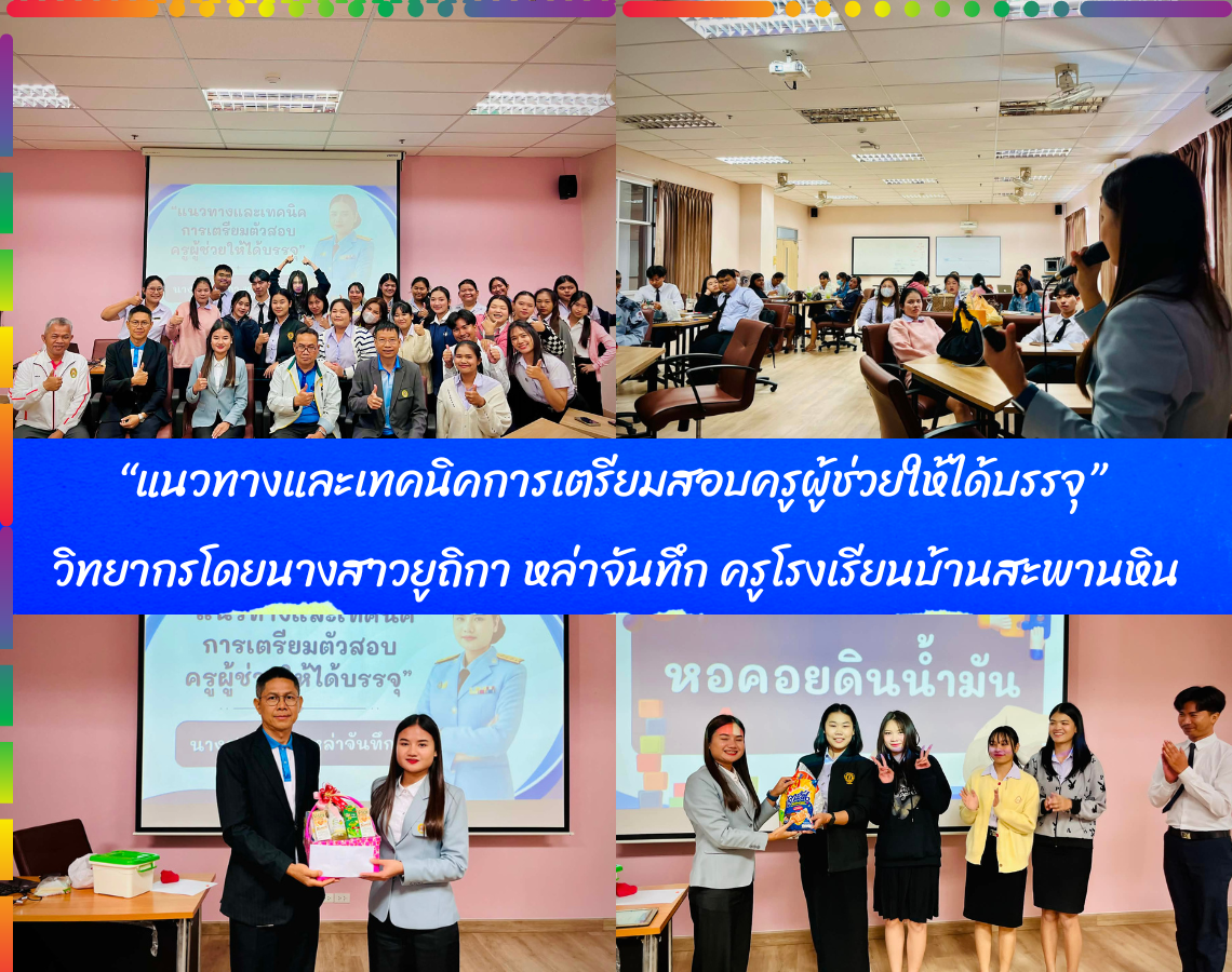 สาขาวิชาพระพุทธศาสนา จัดบรรยายพิเศษ เรื่อง “แนวทางและเทคนิคการเตรียมสอบครูผู้ช่วยให้ได้บรรจุ” โดยศิษย์เก่าผู้ประสบความสำเร็จในการสอบบรรจุข้าราชการครู ได้แก่ นางสาวยูถิกา หล่าจันทึก ครูโรงเรียนบ้านสะพานหิน ตำบลหนองแวง อำเภอเทพารักษ์ จังหวัดนครราชสีมา สังกัดสำนักงานเขตพื้นที่การศึกษาประถมศึกษานครราชสีมา เขต 5 มาเป็นวิทยากรบรรยายให้ความรู้และแลกเปลี่ยนประสบการณ์เกี่ยวกับการเตรียมความพร้อมในการสอบแข่งขันเพื่อบรรจุเป็นข้าราชการครู ภายหลังสำเร็จการศึกษา