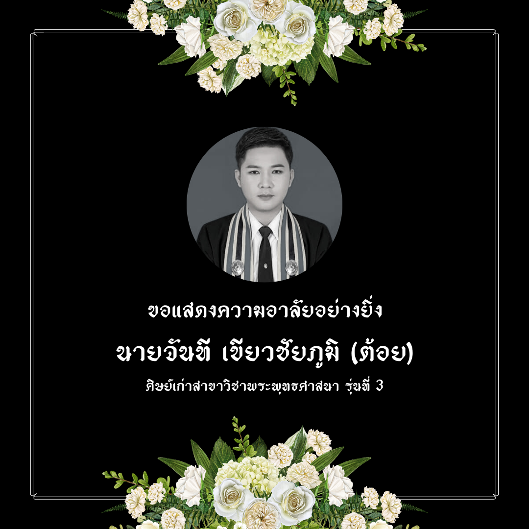 หลักสูตรครุศาสตรบัณฑิต สาขาวิชาพระพุทธศาสนา มหาวิทยาลัยราชภัฏนครราชสีมา ขอแสดงความเสียใจอย่างสุดซึ้งต่อครอบครัวเขียวชัยภูมิ เนื่องในโอกาสการสูญเสียนายจันที เขียวชัยภูมิ (ต้อย) ศิษย์เก่าสาขาวิชาพระพุทธศาสนา รุ่นที่ 3 รหัสนักศึกษา 57 ผู้เป็นที่รักยิ่ง ซึ่งได้จากไปอย่างไม่มีวันหวนกลับ