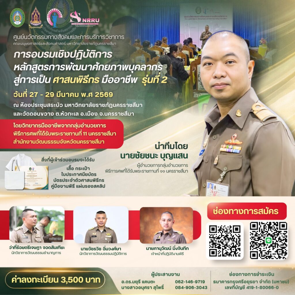 คณะมนุษยศาสตร์และสังคมศาสตร์ มหาวิทยาลัยราชภัฏนครราชสีมา โดยศูนย์นวัตกรรมทางสังคมและการบริการวิชาการ ขอเชิญผู้บริหาร บุคลากรหน่วยงานภาครัฐ องค์กรปกครองส่วนท้องถิ่น หน่วยงานเอกชน ตลอดจนผู้สนใจทั่วไป เข้าร่วมโครงการฝึกอบรมเชิงปฏิบัติการ หลักสูตร “การพัฒนาศักยภาพบุคลากรสู่การเป็นศาสนพิธีกรมืออาชีพ รุ่นที่ 2” ระหว่างวันที่ 27–29 มีนาคม 2569 ณ ห้องประชุมสระบัว มหาวิทยาลัยราชภัฏนครราชสีมา และวัดดอนขวาง อำเภอเมือง จังหวัดนครราชสีมา