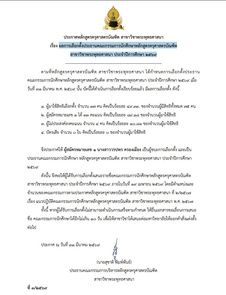 ตามที่หลักสูตรครุศาสตรบัณฑิต สาขาวิชาพระพุทธศาสนา ได้กำหนดให้มีการเลือกตั้งประธานคณะกรรมการนักศึกษาหลักสูตรครุศาสตรบัณฑิต สาขาวิชาพระพุทธศาสนา ประจำปีการศึกษา ๒๕๖๙ เมื่อวันที่ ๓๑ มีนาคม พ.ศ. ๒๕๖๙ ที่ผ่านมา บัดนี้การดำเนินการเลือกตั้งได้เสร็จสิ้นเป็นที่เรียบร้อยแล้ว โดยมีผลการเลือกตั้งดังต่อไปนี้