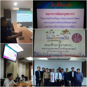 เมื่อวันที่ 17 สิงหาคม 2559 ที่ผ่านมา คณาจารย์โปรแกรมวิชาปรัชญา ศาสนาและเทววิทยา คณะมนุษยศาสตร์และสังคมศาสตร์ มหาวิทยาลัยราชภัฏนครราชสีมา ไปศึกษาดูงานที่ มหาวิทยาลัยราชภัฏมหาสารคามและมหาวิทยาลัยมหาสารคาม ซึ่งได้รับการต้อนรับดูแลอย่างอบอุ่นทั้งสองที่ โดยภาคเช้าเวลา 09.00-12.00 น.ได้ศึกษาดูงานที่ คณะมนุษยศาสตร์และสังคมศาสตร์ มหาวิทยาลัยราชภัฏมหาสารคาม และภาคบ่าย เวลา 13.00-16.00 น.ได้ศึกษาดูงานที่ คณะมนุษยศาสตร์และสังคมศาสตร์ มหาวิทยาลัยมหาสารคาม