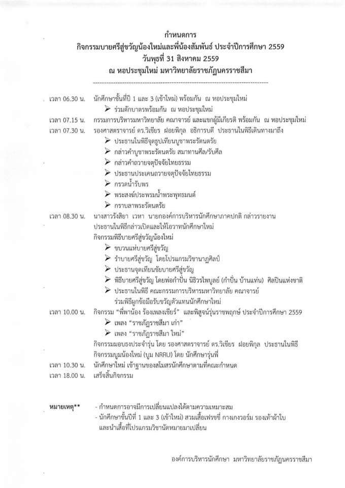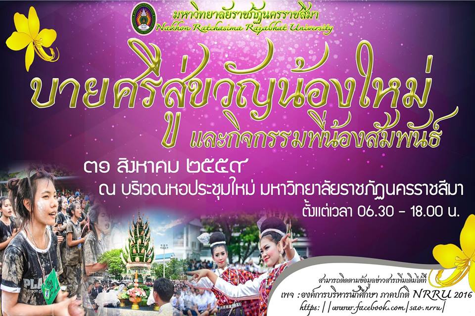 กองพัฒนานักศึกษา ร่วมกับ องค์การบริหารนักศึกษาภาคปกติ ขอเชิญนักศึกษาใหม่ ชั้นปีที่ 1,3 ภาคปกติ ศิษย์เก่า และศิษย์ปัจจุบัน ต้อนรับราชพฤกษ์ช่อใหม่ สู่รั้วตะโกราย เข้าร่วมกิจกรรมทำบุญตักบาตร บายศรีสู่ขวัญน้องใหม่ และพี่น้องสัมพันธ์ ประจำปีการศึกษา 2559 ในวันพุธที่ 31 สิงหาคม 2559 เวลา 06.30-18.00 น. ณ ลานธรรมเฉลิมพระเกียรติฯ และหอประชุมนานาชาติ แนะแนวเรื่อง กำหนดไหว้ครูและบายศรีสู่ขวัญน้องใหม่ สาขาวิชาพุทธศาสนศึกษา ประจำปี 2559 วันที่ 10 กันยายน 2559 ปฏิทินกิจกรรมคณะครุศาสตร์ ประจำภาคการศึกษาที่ 1 ปีการศึกษา 2559