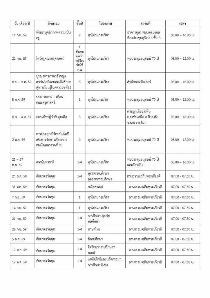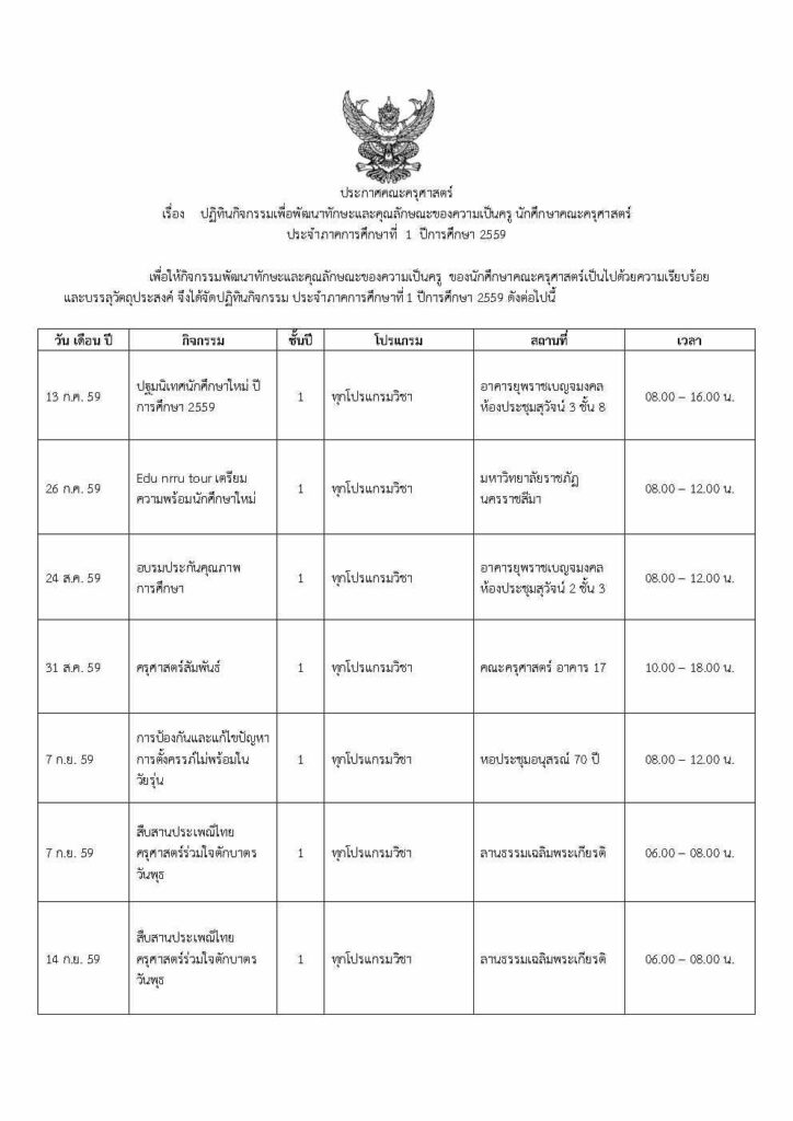 เพื่อให้กิจกรรมพัฒนาทักษะและคุณลักษณะของความเป็นครู ของนักศึกษาคณะครุศาสตร์เป็นไปด้วยความเรียบร้อย และบรรลุวัตถุประสงค์ จึงได้จัดปฏิทินกิจกรรม ประจำภาคการศึกษาที่ 1 ปีการศึกษา 2559 ดังต่อไปนี้