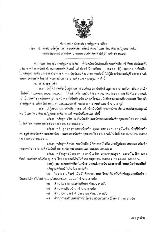 ให้ผู้ที่มีรายชื่อเป็นผู้ผ่านการสอบคัดเลือก บันทึกข้อมูลการรายงานตัวทางอินเทอร์เน็ตเว็บไซต์ http://entrance.nrru.ac.th/entrance/ ให้แล้วเสร็จก่อนวันที่ 28 พฤษภาคม 2560 และพิมพ์ใบรายงานตัวเข้าเป็นนักศึกษา พร้อมติดรูปถ่ายหน้าตรงที่เป็นปัจจุบัน แต่งเครื่องแบบนักศึกษาตามระเบียบของมหาวิทยาลัยราชภัฏนครราชสีมา ไม่สวมหมวก ไม่สวมแว่นตาดำ ขนาด 3×4 เซนติเมตร จำนวน 1 รูป ให้ผู้สอบผ่านการคัดเลือกรายงานตัวเข้าเป็นนักศึกษาของมหาวิทยาลัย ณ หอประชุมอนุสรณ์ 70 ปี ในส่วนของหลักสูตรครุศาสตรบัณฑิต ให้รายงานตัวในวันที่ 29 พฤษภาคม 2560 เวลา 13.00-15.00 น.
