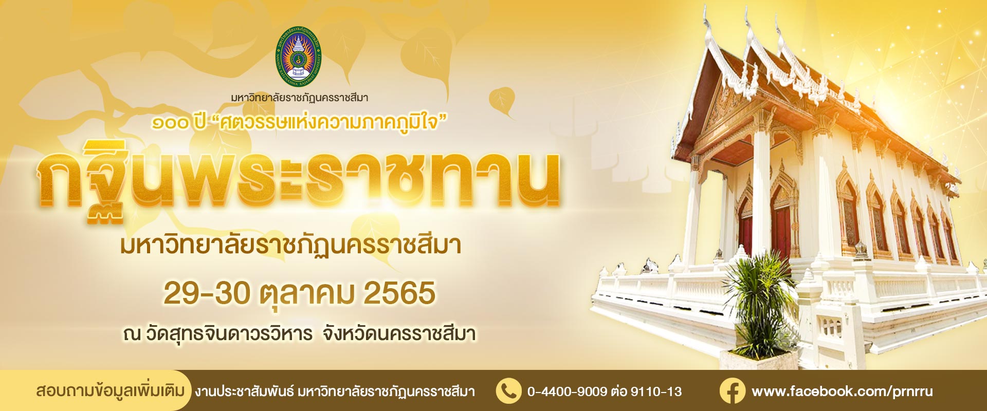 มหาวิทยาลัยราชภัฏนครราชสีมา “ศตวรรษแห่งความภาคภูมิใจ” ขอเชิญร่วมเป็นเจ้าภาพถวายผ้าพระกฐินพระราชทาน ประจำปี ๒๕๖๕ ในวันที่ ๒๙ – ๓๐ ตุลาคม ๒๕๖๕ ณ วัดสุทธจินดาวรวิหาร (พระอารามหลวง) ตำบลในเมือง อำเภอเมือง จังหวัดนครราชสีมา