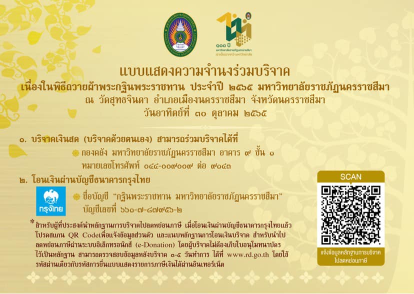 ร่วมบริจาคได้ที่ : ธนาคารกรุงไทย ชื่อบัญชี “กฐินพระราชทาน มหาวิทยาลัยราชภัฏนครราชสีมา” บัญชีเลขที่ ๖๖๑-๗-๘๗๙๕๖-๒