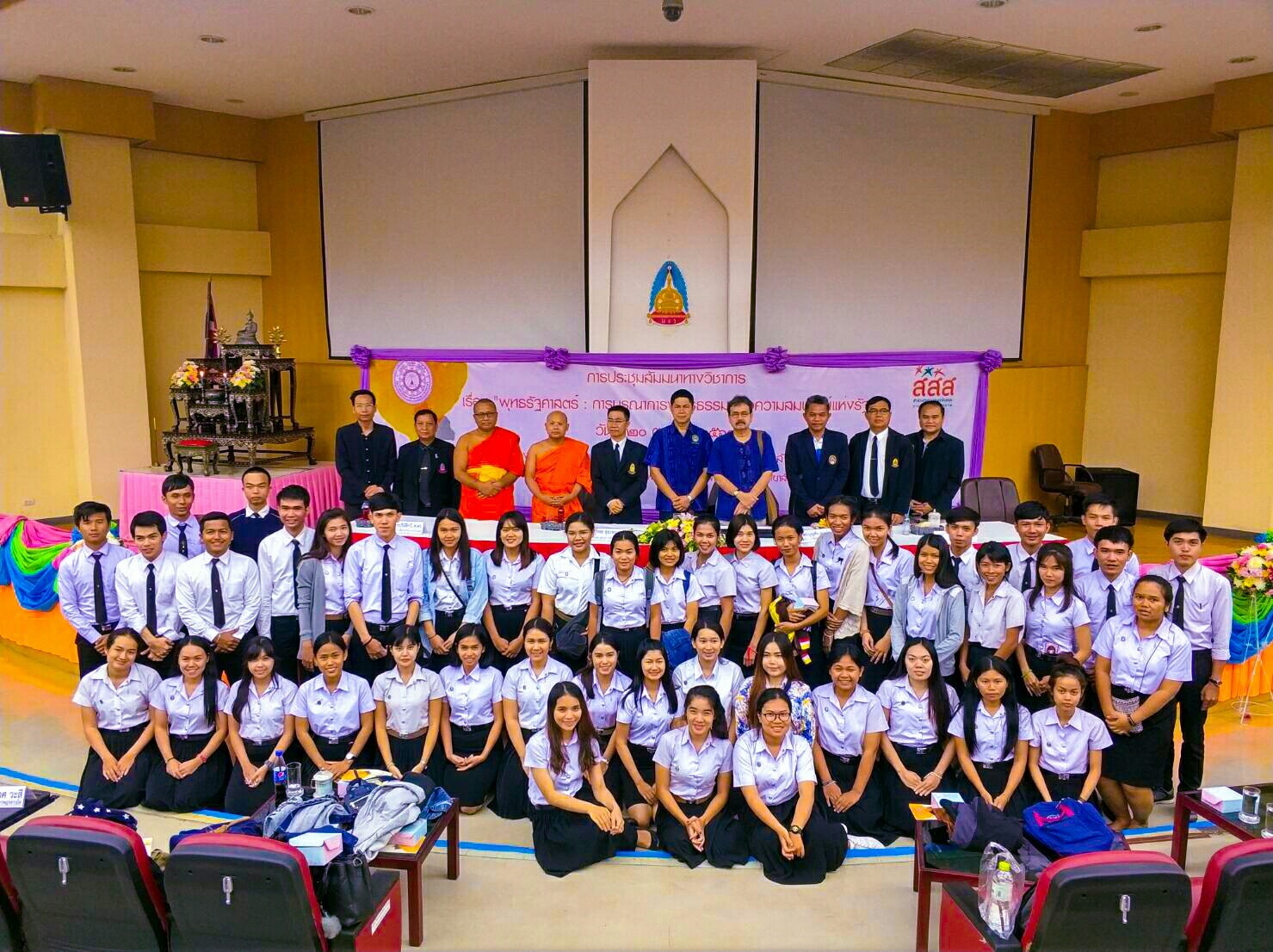 เมื่อวันศุกร์ ที่ ๒๐ ตุลาคม ๒๕๖๐ ที่ผ่านมา นักศึกษาหลักสูตรครุศาสตรบัณฑิต สาขาวิชาพุทธศาสนศึกษา ได้ร่วมกิจกรรมทัศนศึกษาแหล่งเรียนรู้มรดกโลกและสัมมนาวิชาการเรื่อง “พุทธรัฐศาสตร์” โดยช่วงเช้าเวลาประมาณ ๐๖.๑๗ น. เดินทางออกจากมหาวิทยาลัยราชภัฏนครราชสีมาไปยังจังหวัดพระนครศรีอยุธยาและมหาวิทยาลัยมหาจุฬาลงกรณราชวิทยาลัย ภาคเช้าเข้าเยี่ยมชมวัดพระศรีสรรเพชญ์และวัดใหญ่ชัยมงคล จากนั้นช่วงเวลา ๑๒.๓๐ น. ก็ได้เดินทางไปยังมหาวิทยาลัยมหาจุฬาลงกรณราชวิทยาลัย เพื่อร่วมสัมนาเสวนาทางวิชาการเรื่อง “พุทธรัฐศาสตร์ : การบูรณาการพุทธธรรมเพื่อความสมบูรณ์แห่งรัฐ โดยช่วงแรกเวลา ๑๓.๓๐ น. เป็นการปาฐกถาพิเศษ เรื่อง “ธรรมาธิปไตยกับการพัฒนาระบบการเมืองของไทย” โดย ศ.นพ.ประเวศ วะสี และต่อจากนั้นเวลา ๑๔.๔๕ น. ก็เป็นเสวนาทางวิชาการเรื่อง “พุทธรัฐศาสตร์ : การบูรณาการพุทธธรรมเพื่อความสมบูรณ์แห่งรัฐ” จำนวน ๓ ท่าน ประกอบไปด้วย ๑.พระราชปริยัติกวี, ศ.ดร. ๒.ศ.ดร.บุญทัน ดอกไธสง และ ๓.ดร.สมภาร พรมทา โดยกิจกรรมดังกล่าวมีผู้ดำเนินรายการคือ รศ.ดร.สุรพล สุยะพรหม เมื่อเสร็จกิจกรรมแล้วก็เดินทางกลับมหาวิทยาลัยราชภัฏนครราชสีมาโดยสวัสดิภาพ