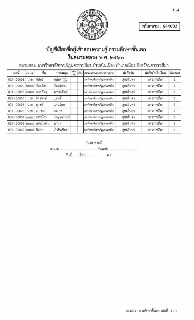 บัญชีเรียกชื่อผู้เข้าสอบความรู้ ธรรมศึกษาชั้นตรี โท และเอก ในสนามหลวง พ.ศ. ๒๕๖๐ สนามสอบ มหาวิทยาลัยราชภัฏนครราชสีมา ตำบลในเมือง อำเภอเมืองนครราชสีมา จังหวัดนครราชสีมา วันพฤหัสบดีที่ ๙ พฤศจิกายน ๒๕๖๐ ตั้งแต่เวลา ๐๘.๐๐ – ๑๗.๐๐ น. ณ อาคาร ๓๖.๐๒.๐๖ คณะมนุษยศาสตร์และสังคมศาสตร์ มหาวิทยาลัยราชภัฏนครราชสีมา