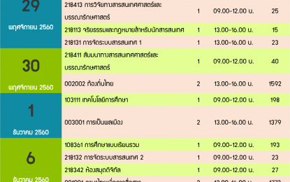 ตามที่หลักสูตรครุศาสตรบัณฑิต สาขาวิชาพุทธศาสนศึกษาได้รับผิดชอบจัดการเรียนการสอนในรายวิชาวิถีแห่งชีวิต รหัสวิชา 002001 โดยทางมหาวิทยาลัยกำหนดสอบปลายภาค สำหรับเทอม 1/2560 ในระหว่างวันที่ 27 พฤศจิกายน – 15 ธันวาคม 2560 ในส่วนรายวิชาวิถี