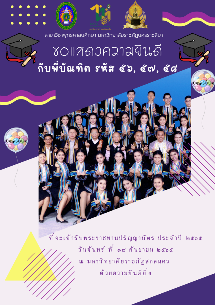 สาขาวิชาพุทธศาสนศึกษา มหาวิทยาลัยราชภัฏนครราชสีมา ขอแสดงความยินดีกับพี่บัณฑิต รหัส ๕๖, ๕๗, ๕๘ ที่จะเข้ารับพระราชทานปริญญาบัตร ประจำปี ๒๕๖๕ ซ้อมใหญ่ วันศุกร์ ที่ ๑๖ กันยายน ๒๕๖๕ @มรภ.นครราชสีมา รับจริง วันจันทร์ ที่ ๑๙ กันยายน ๒๕๖๕ @มรภ.สกลนคร ด้วยความยินดียิ่ง … แนะแนวเรื่อง เชิญร่วมงานแสดงกตเวทิตาจิตแด่ผู้เกษียณอายุราชการ ประจำปี 2565 “วันวานที่พากเพียร สู่วันเกษียณที่ภาคภูมิ” ขอเชิญร่วมพิธีวางศิลาฤกษ์พุทธมณฑลจังหวัดนครราชสีมา วันพฤหัสบดี ที่ 15 กันยายน 2565 เวลา 09.00 น. เป็นต้นไป