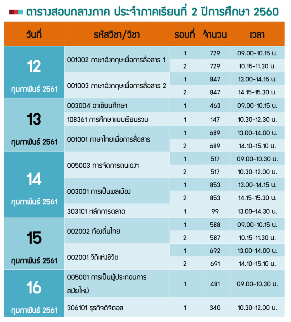 ตามที่หลักสูตรครุศาสตรบัณฑิต สาขาวิชาพุทธศาสนศึกษาได้รับผิดชอบจัดการเรียนการสอนในรายวิชาวิถีแห่งชีวิต รหัสวิชา 002001 โดยทางมหาวิทยาลัยกำหนดสอบกลางภาค สำหรับเทอม 2/2560 ในระหว่างวันที่ 12 – 16 กุมภาพันธ์ 2561 ในส่วนรายวิชาวิถี