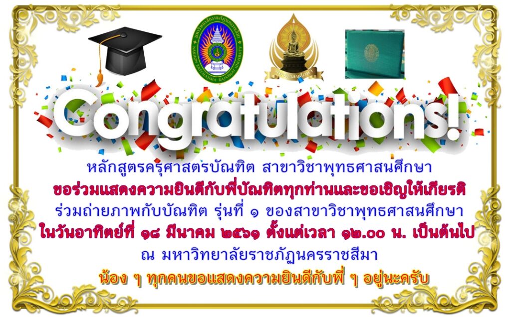 หลักสูตรครุศาสตรบัณฑิต สาขาวิชาพุทธศาสนศึกษา ขอร่วมแสดงความยินดีกับพี่บัณฑิตทุกท่านและขอเชิญให้เกียรติ