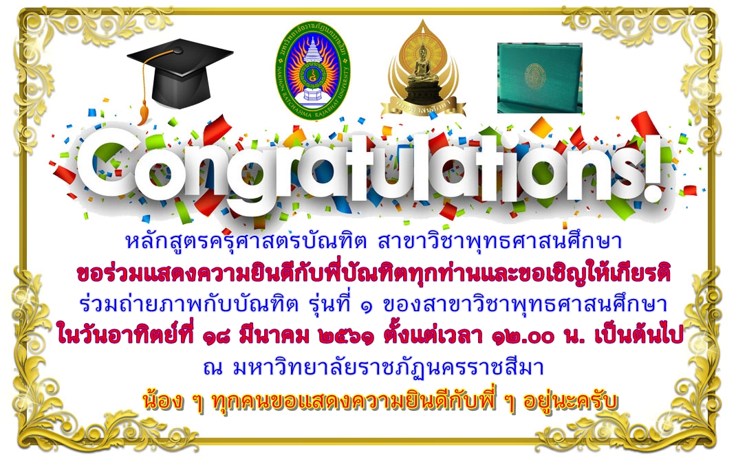 ร่วมถ่ายภาพกับบัณฑิต รุ่นที่ ๑ ของสาขาวิชาพุทธศาสนศึกษา ในวันอาทิตย์ที่ ๑๘ มีนาคม ๒๕๖๑ ตั้งแต่เวลา ๑๒.๐๐ น. เป็นต้นไป