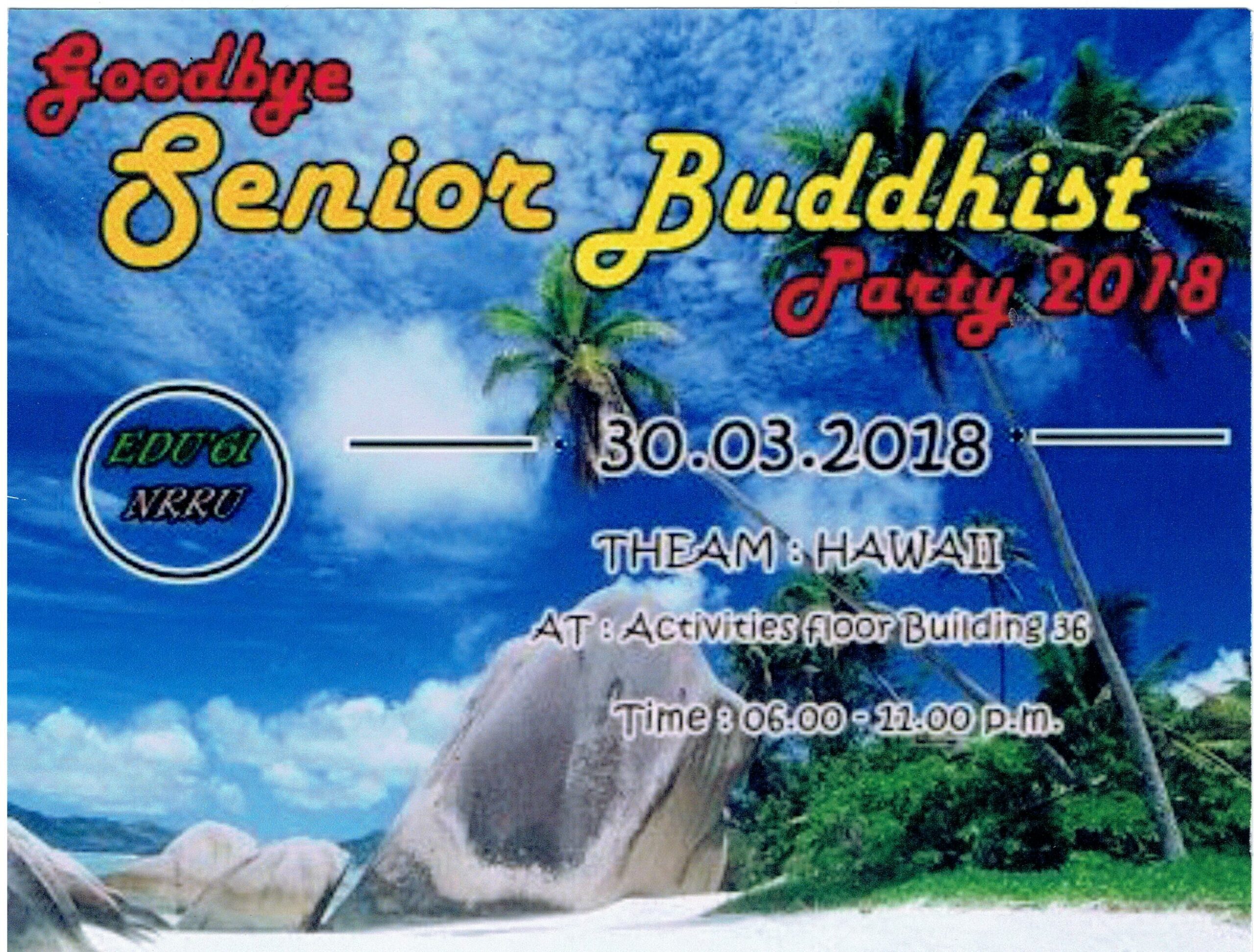 เชิญร่วมกิจกรรมส่งพี่ให้ถึงฝันกู๊ดบายซีเนียร์ หลักสูตรครุศาสตรบัณฑิต สาขาวิชาพุทธศาสนศึกษา คณะครุศาสตร์ มหาวิทยาลัยราชภัฏนครราชสีมา สาขาวิชาพุทธศาสนศึกษารุ่นที่ 2 ในวันที่ 30 มีนาคม 2561 ณ ลานกิจกรรมอาคารคณะมนุษยศาสตร์และสังคมศาสตร์ ตั้งแต่เวลา 17.00 น. เป็นต้นไป