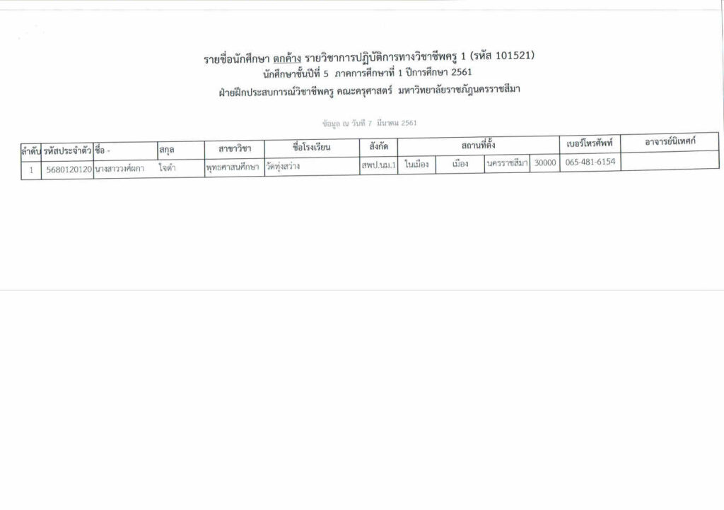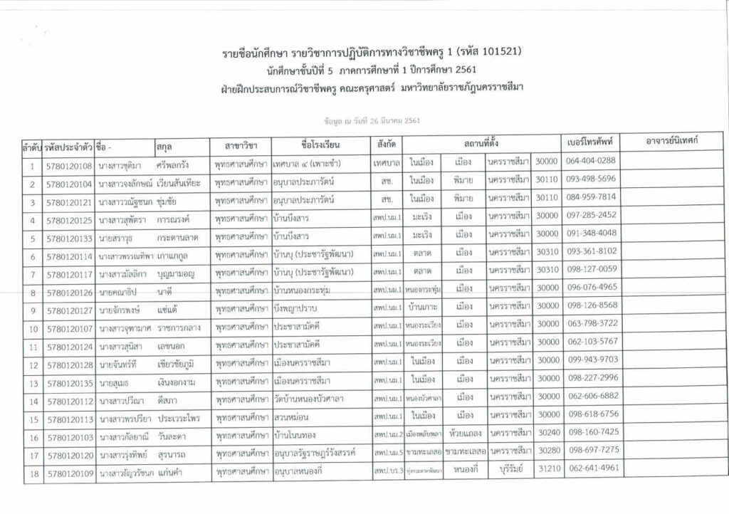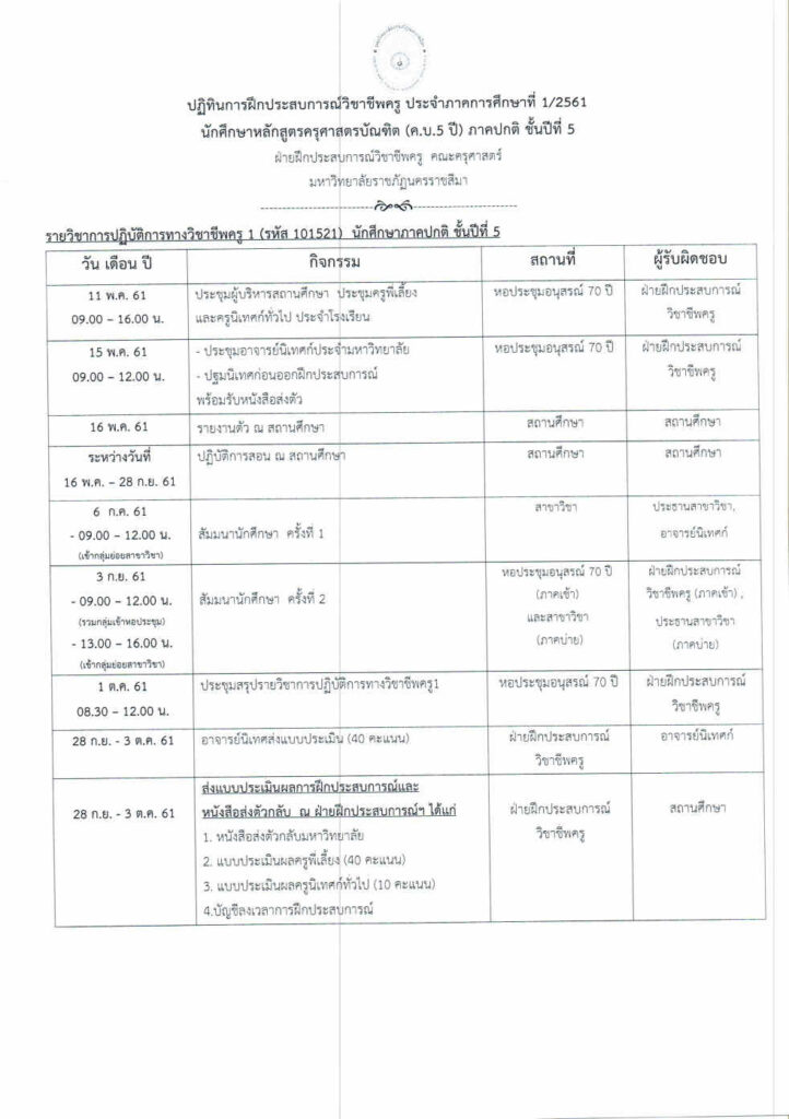 ปฏิทินและข้อมูลโรงเรียนฝึกสอนของนักศึกษาชั้นปีที่ 5 ภาคการศึกษาที่ 1 ปีการศึกษา 2561 รายวิชารายวิชาการปฏิบัติการทางวิชาชีพครู 1 (รหัส 101521) หลักสูตรครุศาสตรบัณฑิต สาขาวิชาพุทธศาสนศึกษา คณะครุศาสตร์ มหาวิทยาลัยราชภัฏนครราชสีมา