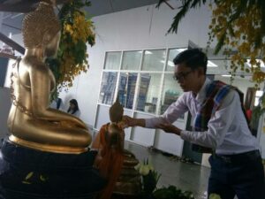 หลักสูตรครุศาสตรบัณฑิต สาขาวิชาพุทธศาสนศึกษา คณะมนุษยศาสตร์และสังคมศาสตร์ มหาวิทยาลัยราชภัฏนครราชสีมา จัดงานสรงน้ำหลวงพ่อใหญ่ “พระพุทธศาสนสิกขมงคล” พระประธานประจำสาขาวิชาพุทธศาสนศึกษา เนื่องในเทศกาลตรุษสงกรานต์ ในวันอังคารที่ 10 เมษายน 2561 ณ อาคาร 36 คณะมนุษยศาสตร์และสังคมศาสตร์ มหาวิทยาลัยราชภัฏนครราชสีมา โดยมีพิธีสรงน้ำพระพุทธรูปพระพุทธศาสนสิกขมงคล เสร็จแล้วก็ได้รดน้ำดำหัวขอพรจากคณาจารย์ในหลักสูตร โดยบรรยากาศเป็นไปด้วยความอบอุ่นและอิ่มบุญในเทศกาลตรุษสงกรานต์ ประจำปี 2561