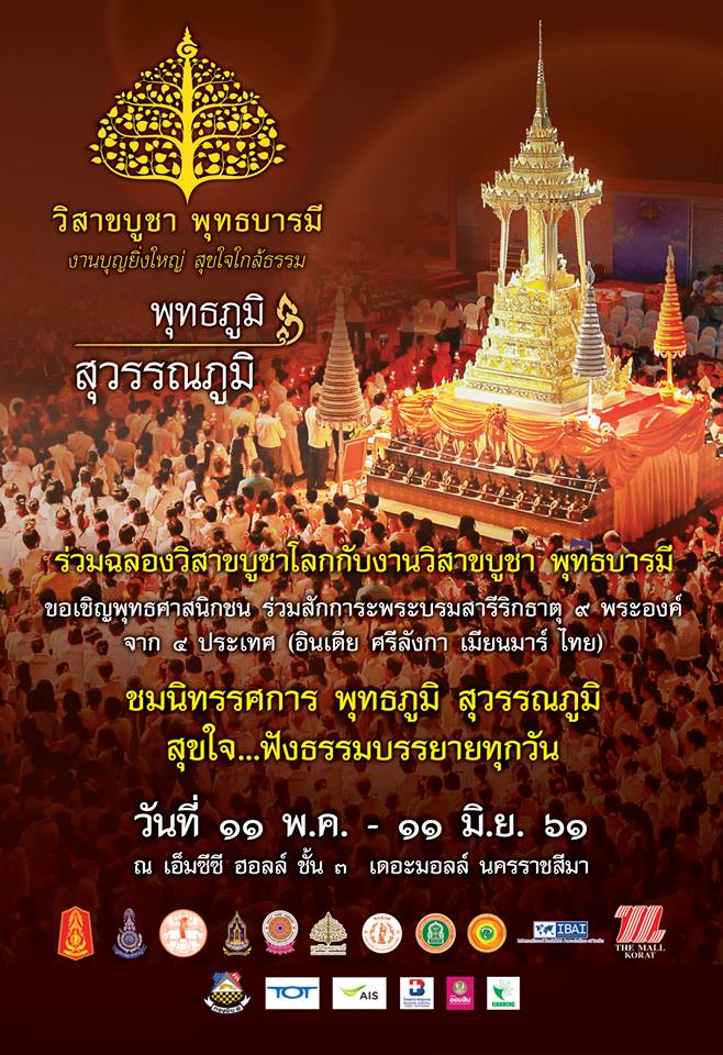 มหาวิทยาลัยราชภัฏนครราชสีมา ขอเชิญคณาจารย์ บุคลากร นักศึกษา และพุทธศาสนิกชนทุกท่าน ร่วมสร้างทาน บุญบารมี ในงาน “วิสาขบูชา พุทธบารมี งานบุญยิ่งใหญ่ สุขใจใกล้ธรรม” พุทธภูมิ สุวรรณภูมิ ระหว่างวันที่ 11 พฤษภาคม-11 มิถุนายน 2561 ณ เอ็มซีซีฮอลล์ ชั้น 3 ห้างสรรพสินค้าเดอะมอลล์นครราชสีมา