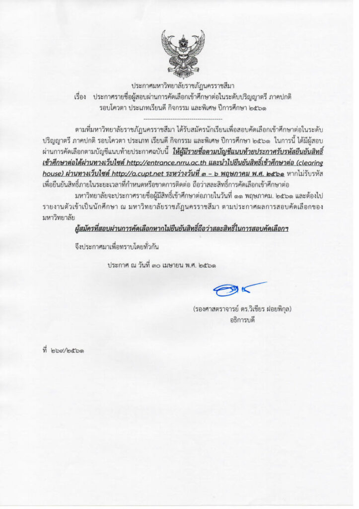 และต้องไปรายงานตัวเข้าเป็นนักศึกษา ณ มหาวิทยาลัยราชภัฏนครราชสีมา ตามประกาศผลการสอบคัดเลือกของมหาวิทยาลัย