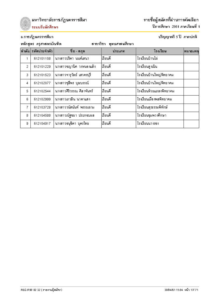 ประกาศรายชื่อผู้สอบผ่านการคัดเลือกเข้าศึกษาต่อในระดับปริญญาตรี ภาคปกติ รอบโควตา ประเภทเรียนดี กิจกรรม และพิเศษ ปีการศึกษา 2561 ประเภทเรียนดี กิจกรรม และพิเศษ หลักสูตรครุศาสตรบัณฑิต สาขาวิชาพุทธศาสนศึกษา