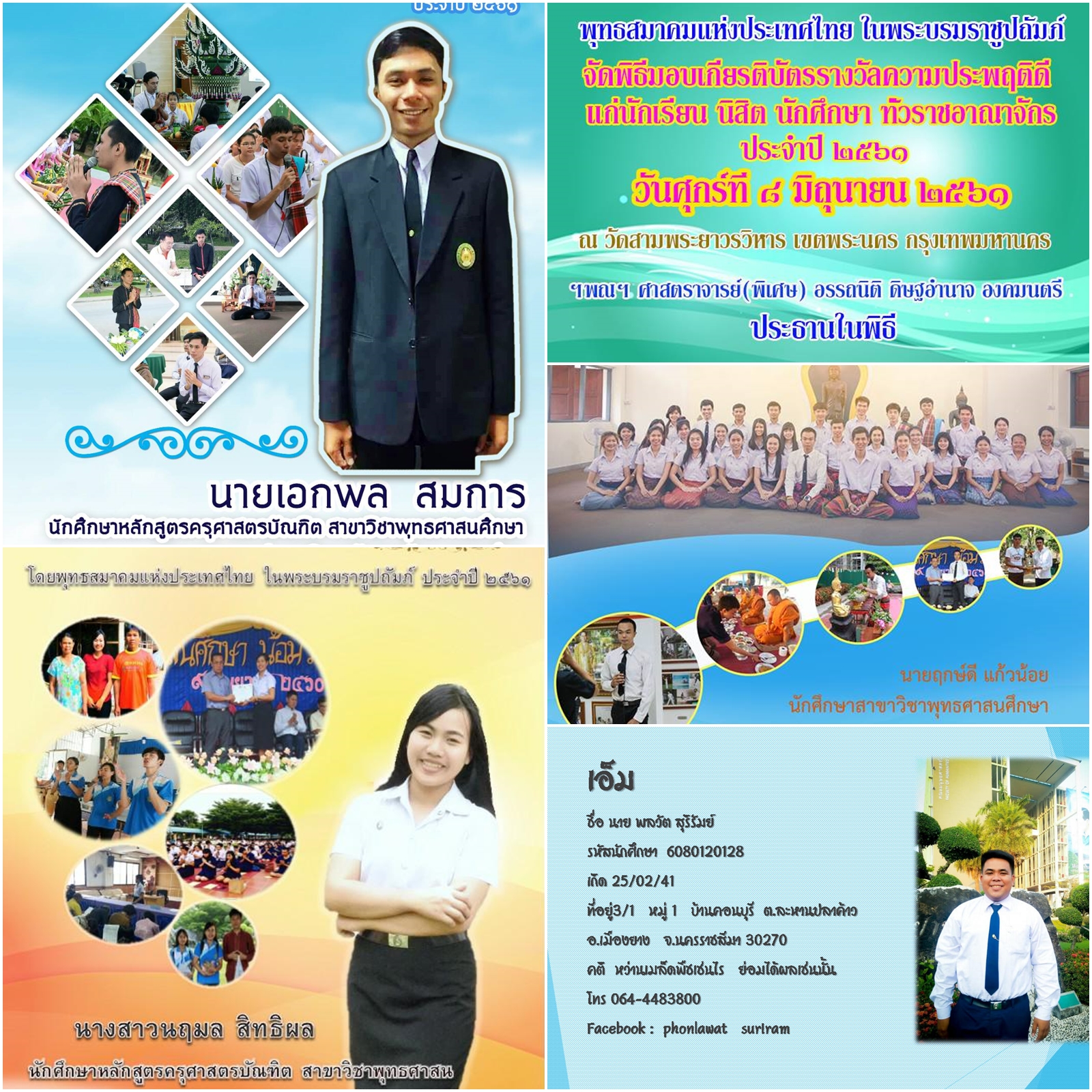 ตามที่คณะกรรมการพุทธสมาคมแห่งประเทศไทย ได้ประกาศรายชื่อผู้ได้รับ รางวัลความประพฤติดี พุทธสมาคมแห่งประเทศไทย ในพระบรมราชูปถัมถ์ ประจำปี 2561 นั้น ซึ่งนายเอกพล สมการ นางสาวนฤมล สิทธิผล นายฤกษ์ดี แก้วน้อย และนายพลวัต สุริรัมย์ นักศึกษาสาขาพุทธศาสนศึกษา คณะครุศาสตร์ มหาวิทยาลัยราชภัฏนครราชสีมา ได้รับรางวัลดังกล่าว ทางหลักสูตรครุศาสตรบัณฑิต สาขาวิชาพุทธศาสนศึกษา จึงขอแสดงความยินดีมา ณ โอกาสนี้