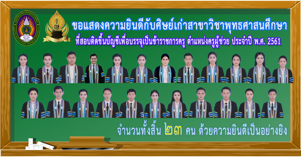 ในโอกาสนี้ทางหลักสูตรขอแสดงความชื่นชมยินดีกับศิษย์เก่าของหลักสูตรครุศาสตรบัณฑิต สาขาวิชาพุทธศาสนศึกษา ที่สามารถสอบติดขึ้นบัญชีครูผู้ช่วย ประจำปี 2561 ทุกๆคน ด้วยความยินดียิ่ง