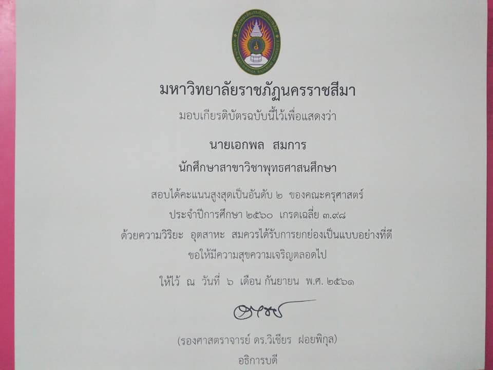 ตามที่มหาวิทยาลัยราชภัฏนครราชสีมาได้จัดงานวันไหว้ครูของนักศึกษาใหม่ ประจำปีการศึกษา ๒๕๖๑ ซึ่งนอกจากที่จะมีงานไหว้ครูแล้วก็ยังได้มีการกิจกรรมอื่น ๆ อีกหลาย ๆ อย่าง โดยส่วนหนึ่งของกิจกรรมก็คือการมอบเกียรติบัตรให้นักศึกษาที่สอบได้คะแนนสูงสุดของปีการศึกษาที่ผ่านมา โดยในส่วนของนักศึกษาหลักสูตรครุศาสตรบัณพิต สาขาวิชาพุทธศาสนศึกษานั้นมีนายเอกพล สมการ นักศึกษาชั้นปีที่ ๔ ที่สอบได้คะแนนสูงสุดเป็นอันดับ ๒ ของคณะครุศาสตร์ โดยมีเกรดเฉลี่ยที่ ๓.๙๘ ประจำปีการศึกษา ๒๕๖๐ ซึ่งมีการมอบเกียรติบัตรแสดงความยินดีโดยท่านอธิการบดีมหาวิทยาลัยราชภัฏนครราชสีมา รองศาสตราจารย์ ดร.วิเชียร ฝอยพิกุล เป็นผู้มอบเกียรติบัตรให้กับนักศึกษาที่ได้รับรางวัลดังกล่าว