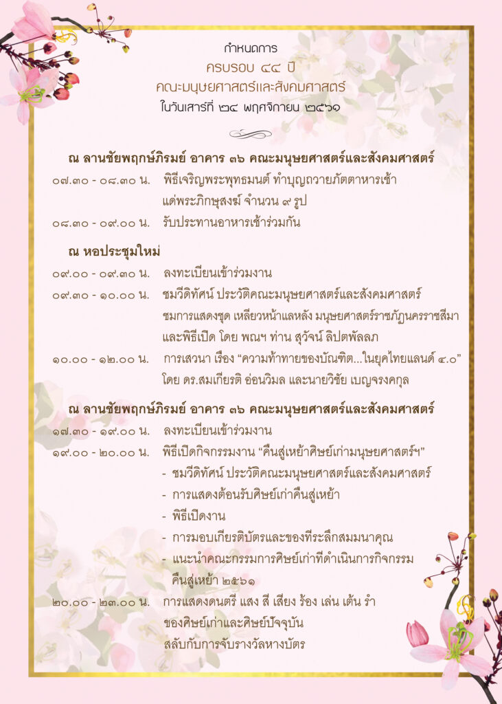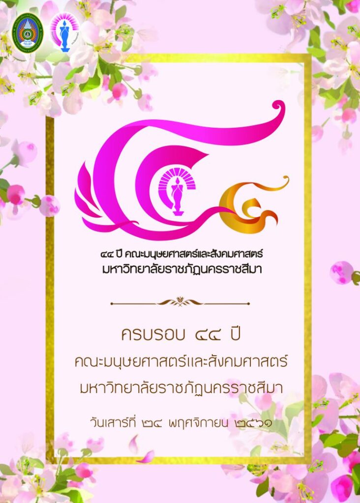 ขอเชิญร่วมงานครบรอบ 44 ปี คณะมนุษยศาสตร์และสังคมศาสตร์ มหาวิทยาลัยราชภัฏนครราชสีมา ในวันเสาร์ที่ 24 พฤศจิกายน 2561 ซึ่งมีกิจกรรมต่าง ๆ ดังต่อไปนี้